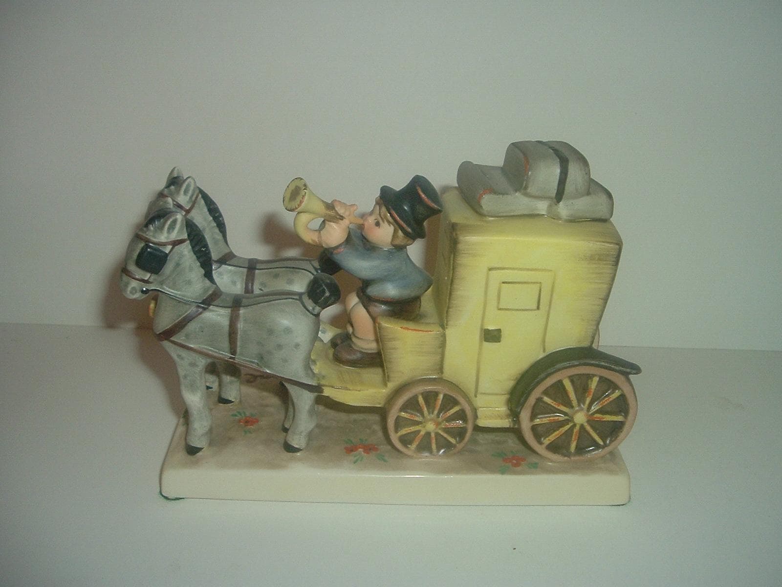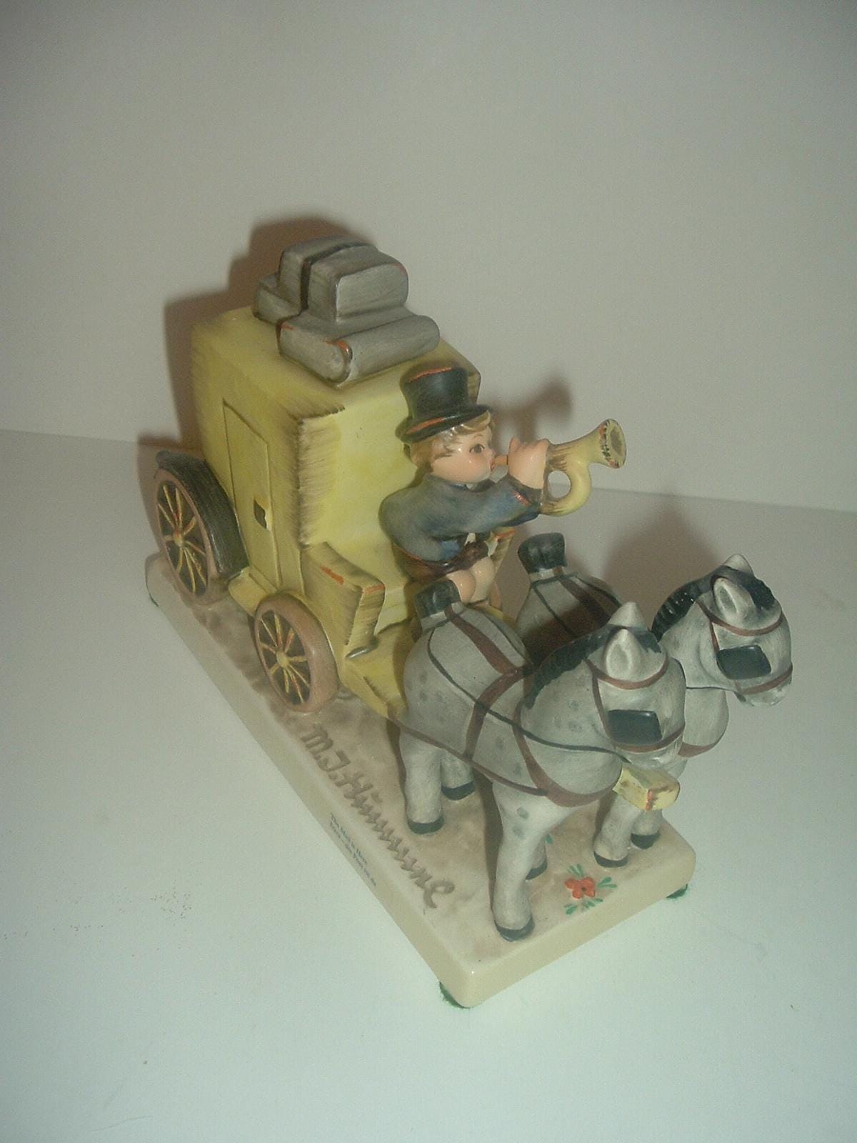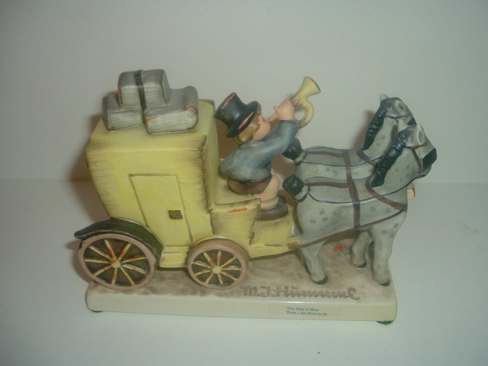 This Hummel HUM 226 The Mail Is Here boy on stagecoach figurine measures approx. 4.5"H and approx. 6.5"L. It is excellent, with no chips, no cracks, and no wear. The missing Bee -- TMK 6 -- mark is on the bottom. Figurine only -- no box. A nice one! I gladly combine shipping.