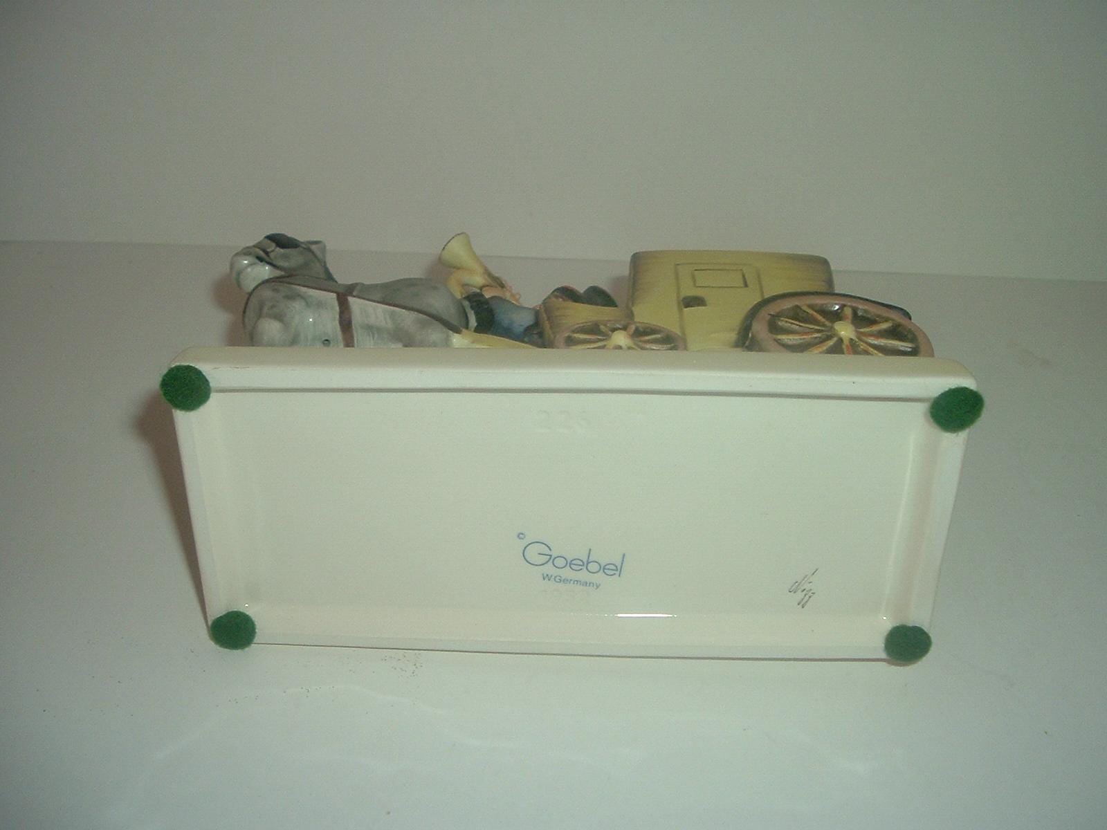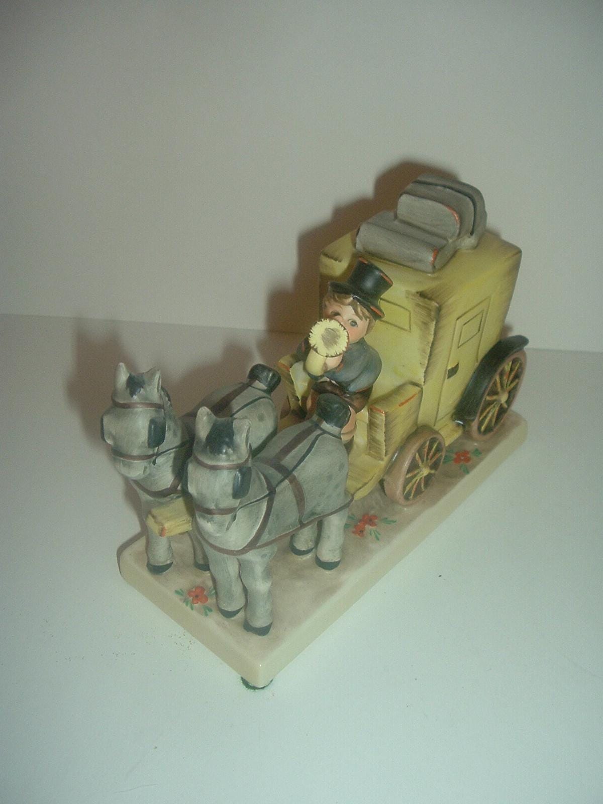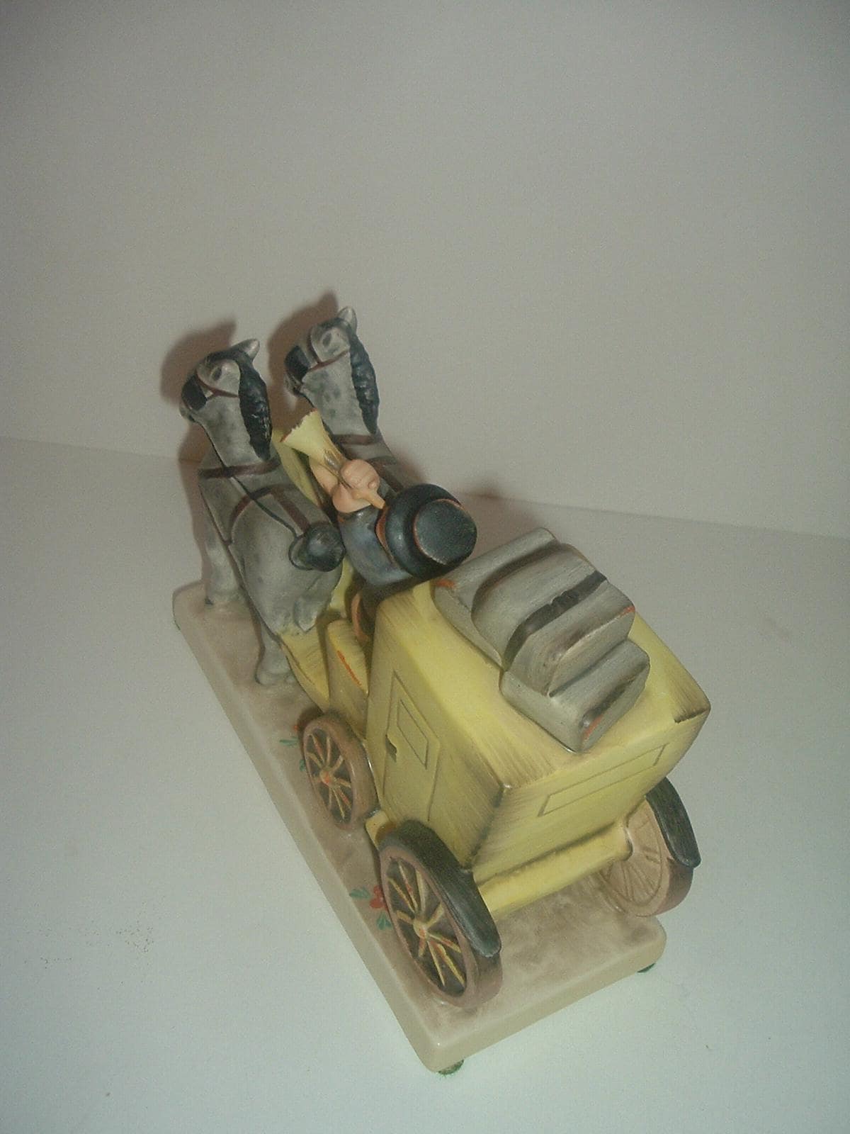 This Hummel HUM 226 The Mail Is Here boy on stagecoach figurine measures approx. 4.5"H and approx. 6.5"L. It is excellent, with no chips, no cracks, and no wear. The missing Bee -- TMK 6 -- mark is on the bottom. Figurine only -- no box. A nice one! I gladly combine shipping.