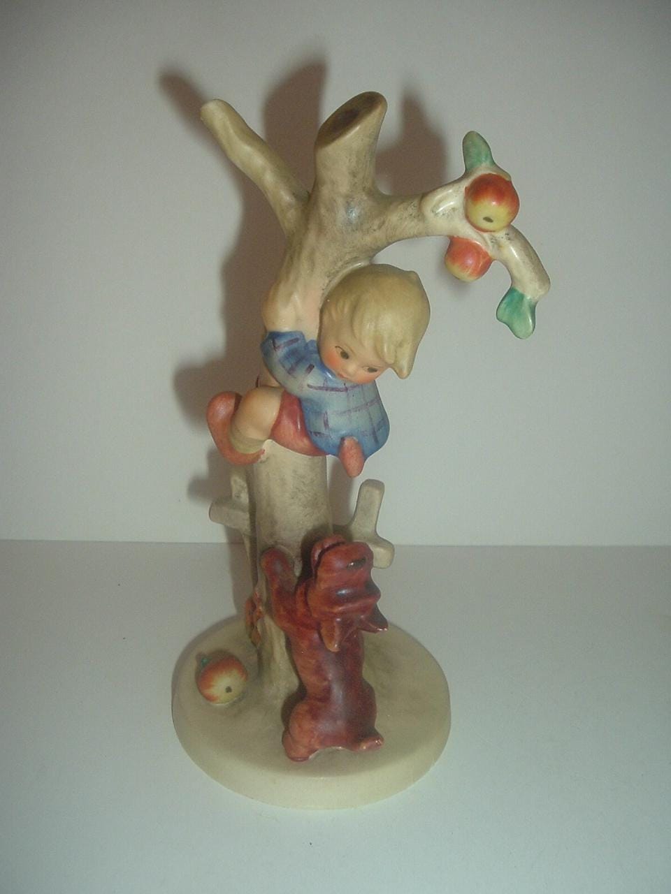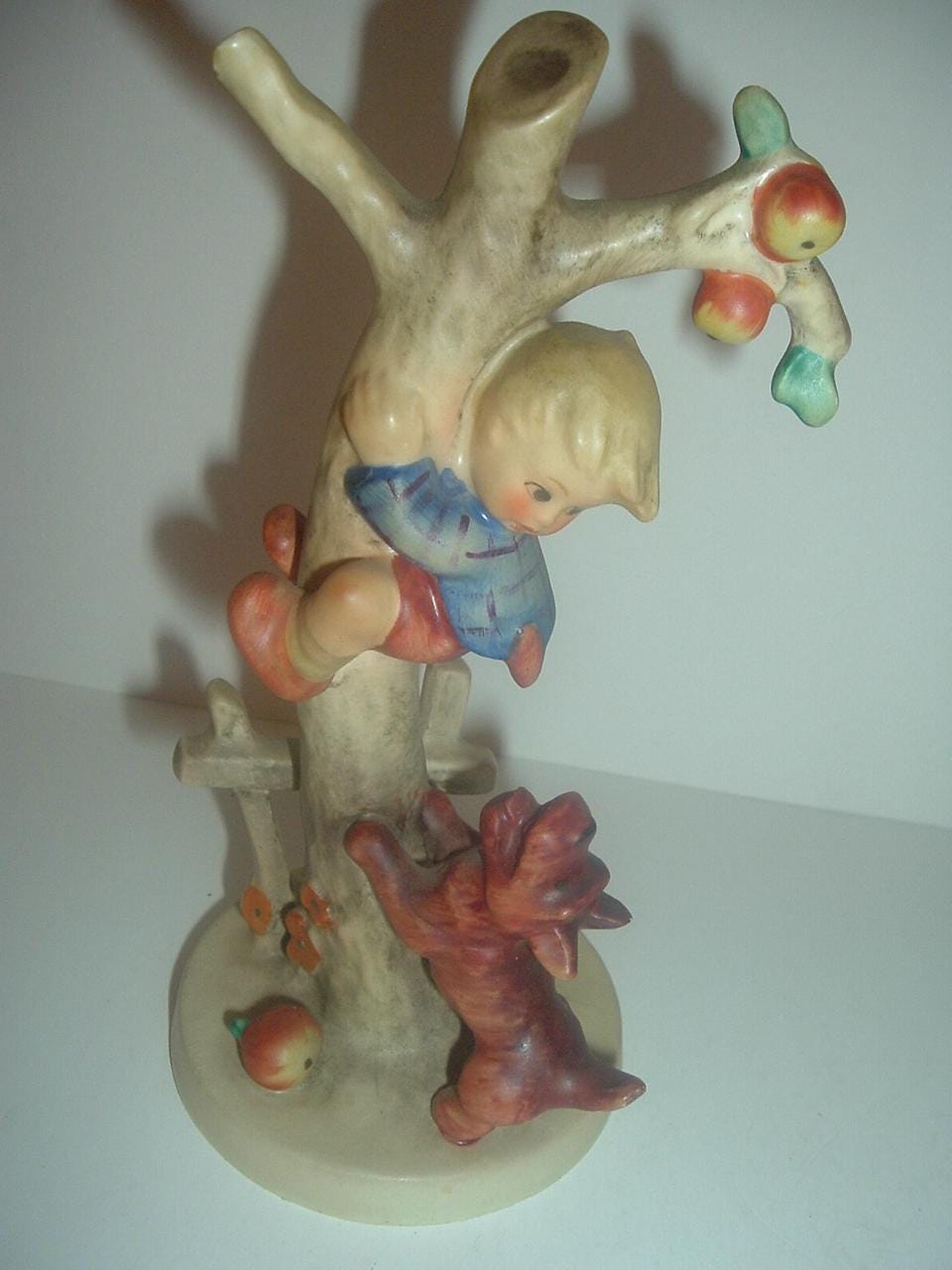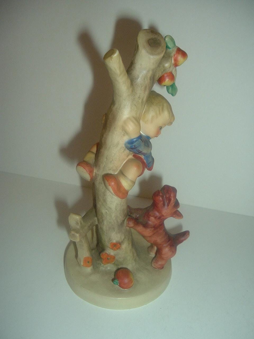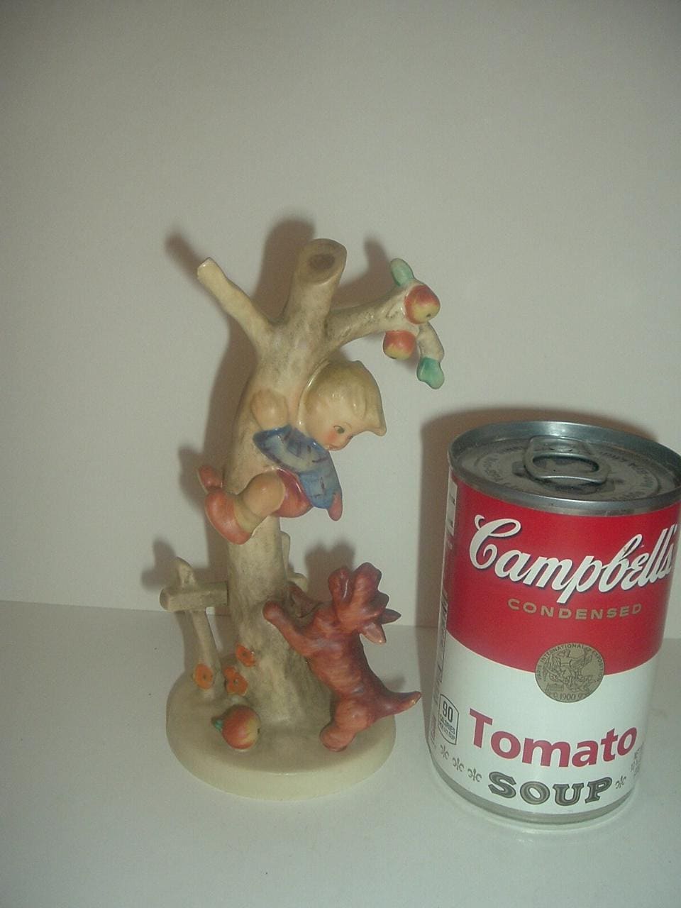 This Hummel HUM 56 Out of danger -- boy in tree with dog figurine measures approx. 6.25"H. It is excellent, with no chips, no cracks, and no wear -- I do notice some fine, light glaze crazing on the underside bottom. The stylized bee -- TMK 3 -- mark is on the bottom. Figurine only -- no box. A nice one! I gladly combine shipping.