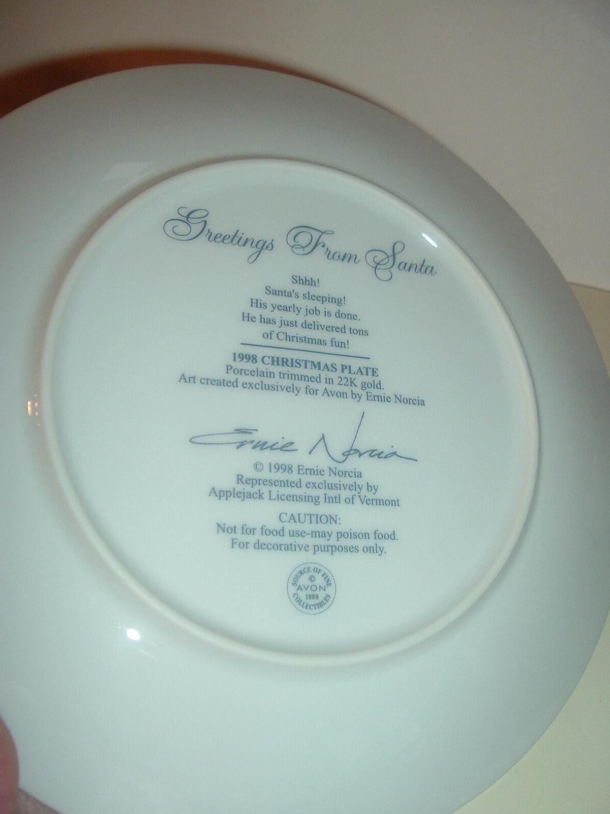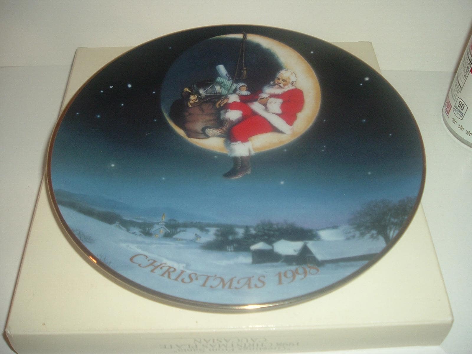 This 1998 Greetings From Santa Plate measures approx. 8.25" across. This Avon Collectibles Santa in the moon decorated piece, is in excellent condition with no chips, no cracks, and no wear or scratching. Box is still in good shape with a little light shelf wear. A nice one! I gladly combine shipping.