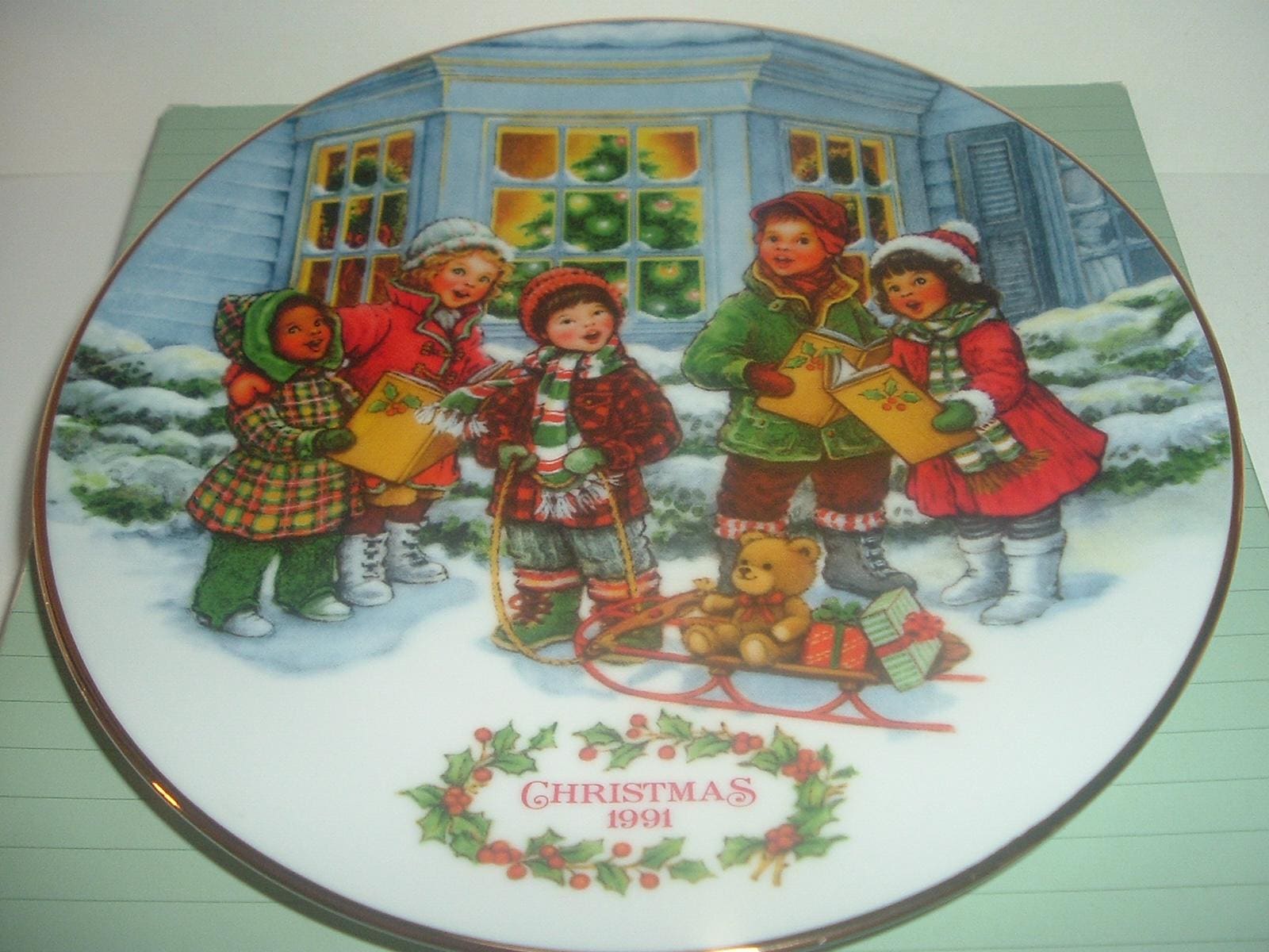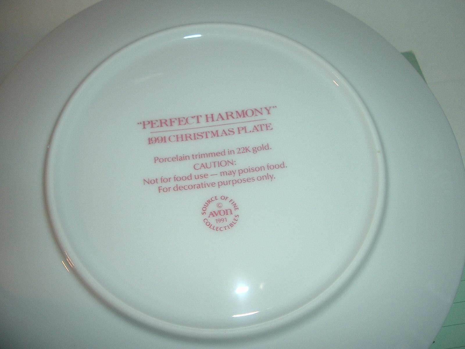 This 1991 Perfect Harmony plate measures approx. 8" across. This Avon Fine Collectibles piece decorated with child carolers, is in excellent condition with no chips, no cracks, and no wear or scratching. Box is still in good shape with a little light shelf wear. A nice one! I gladly combine shipping.