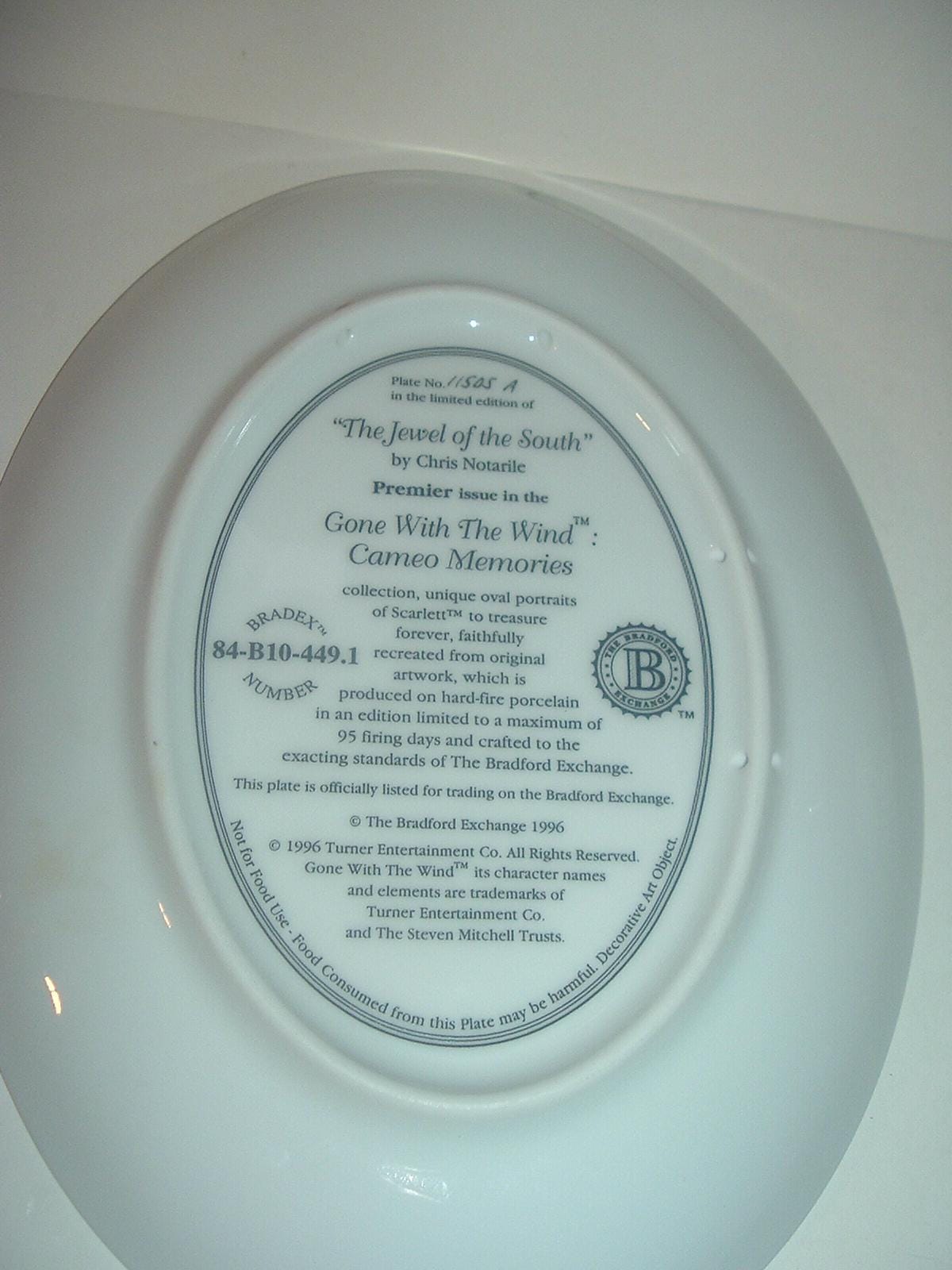 This "The Jewel of the South" oval plate measures approx. 8 5/8"L and 6.5"W. It was the premier issue of the Gone With The Wind Cameo Memories series, and is in excellent condition with no chips, no cracks, and no wear or scratching. No box or paperwork with this one. Nice! I gladly combine shipping.