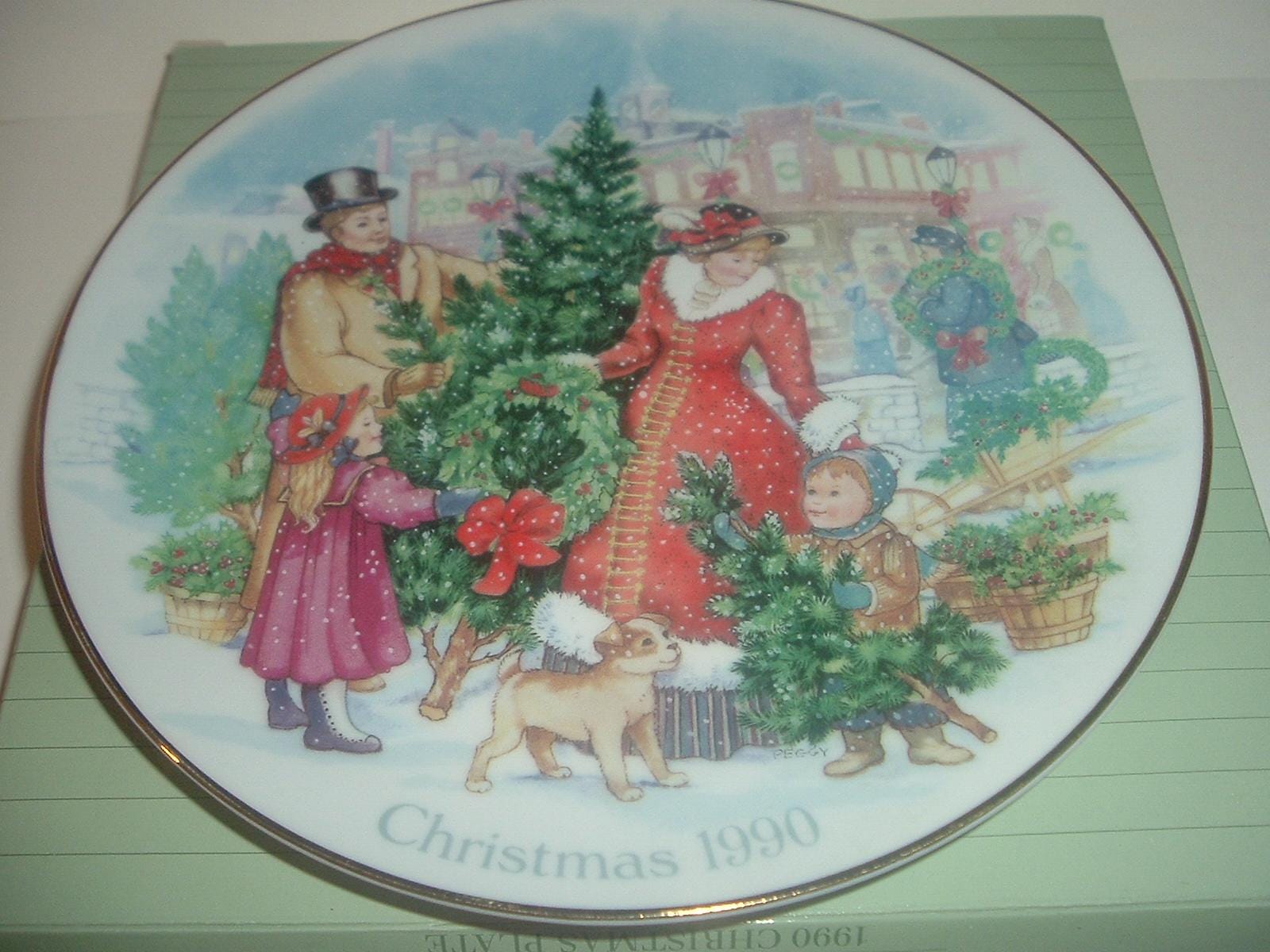 This 1990 Bringing Home Christmas plate measures approx. 8" across. This Avon Fine Collectibles piece decorated with a Victorian style family choosing evergreens, is in excellent condition with no chips, no cracks, and no wear or scratching. Box is still in good shape with a little light shelf wear. A nice one! I gladly combine shipping.
