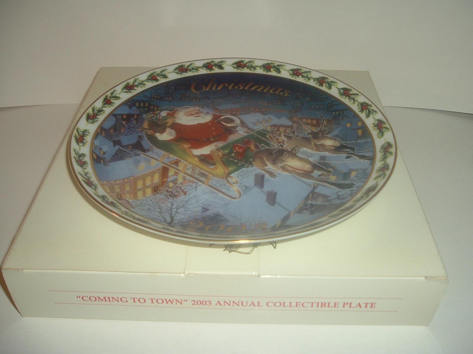 This 2003 Coming To Town -- Santa in sleigh -- plate measures approx. 8.25" across. This Avon Fine Collectibles piece, is in excellent condition with no chips, no cracks, and no wear or scratching. Box is still in good shape with a little light shelf wear. A nice one! I gladly combine shipping.