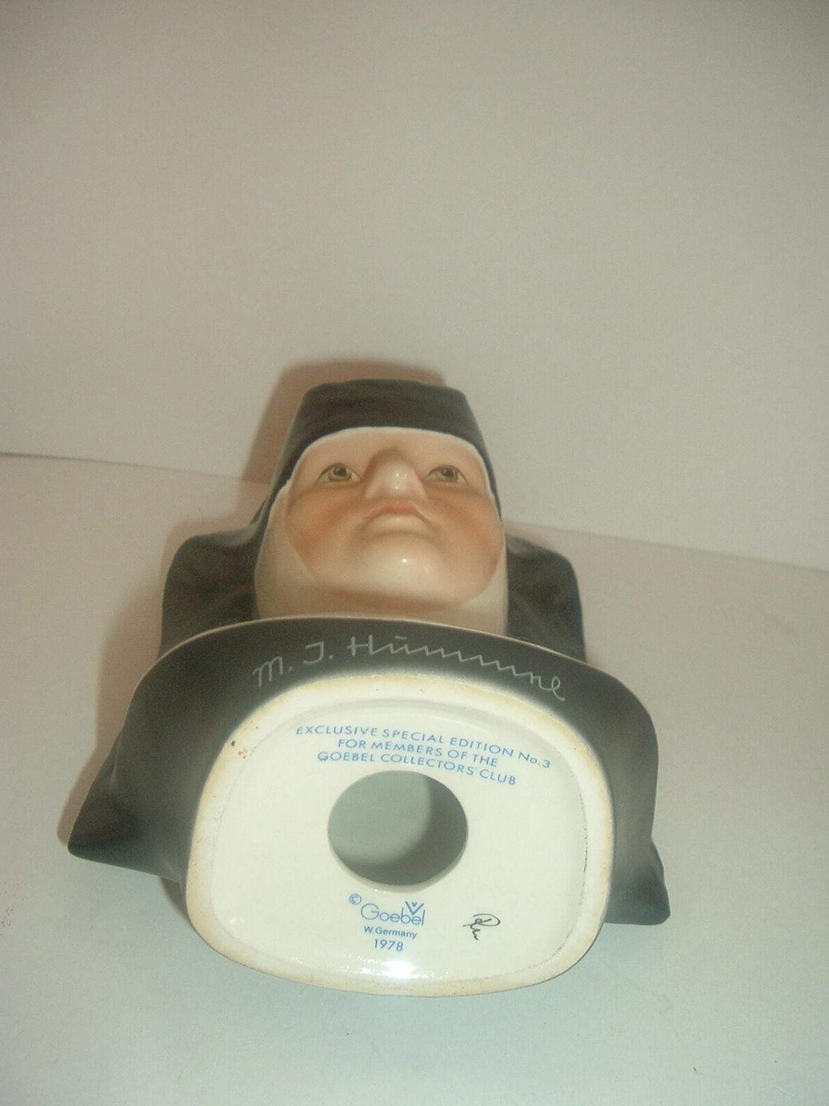 This Goebel W Germany Sister Berta M.J. Hummel bust figurine measures approx. 5 7/8"H. This one was an exclusive special edition No. 3 for members of the Goebel Collectors Club, and is excellent, with no chips, no cracks, and no wear. The bee over e -- TMK 5 -- mark is on the bottom. Figurine only -- no box. A nice one! I gladly combine shipping.