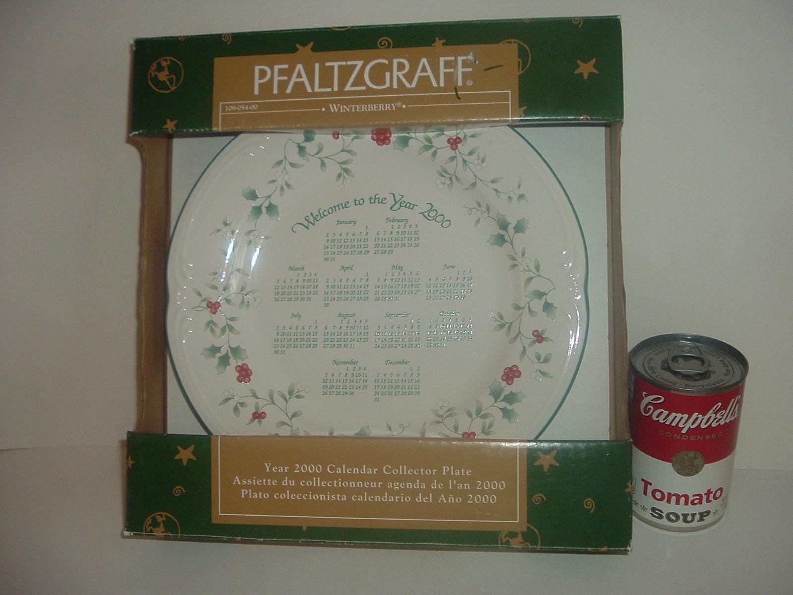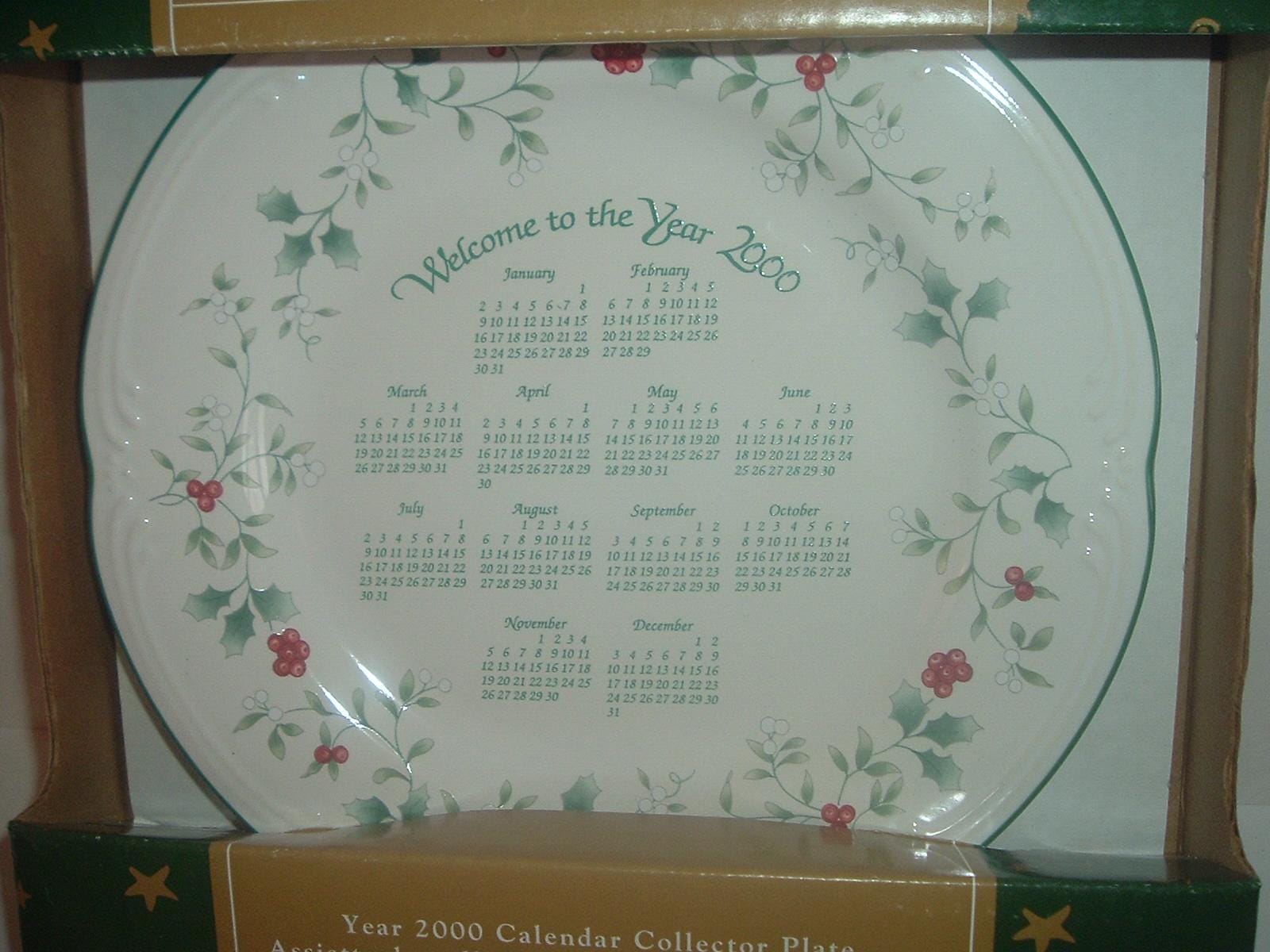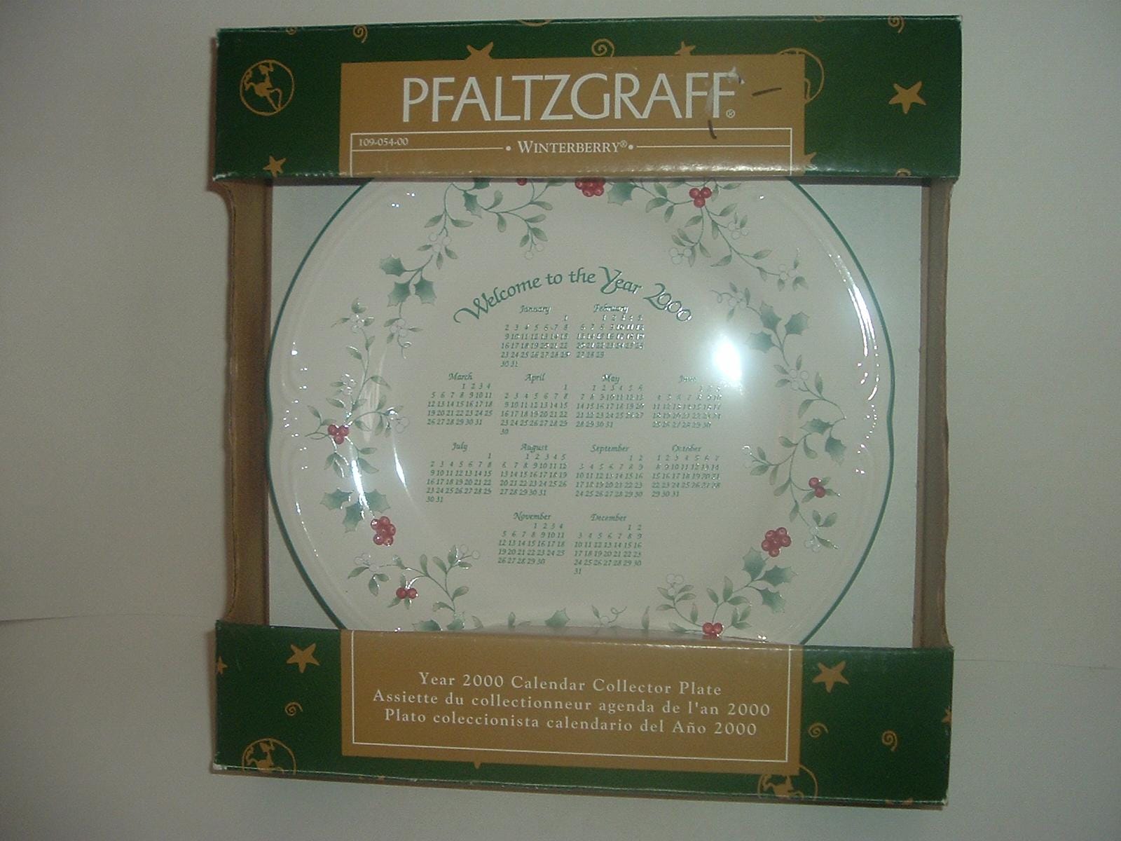 This Pfaltzgraff Winterberry pattery "Welcome to the Year 2000" calendar collector plate measures approx. 10" across (not including the box). It is in excellent condition with no chips, no cracks, and no wear or scratching. It comes with its box -- which is in OK shape with some shelf wear. A nice one! I gladly combine shipping.