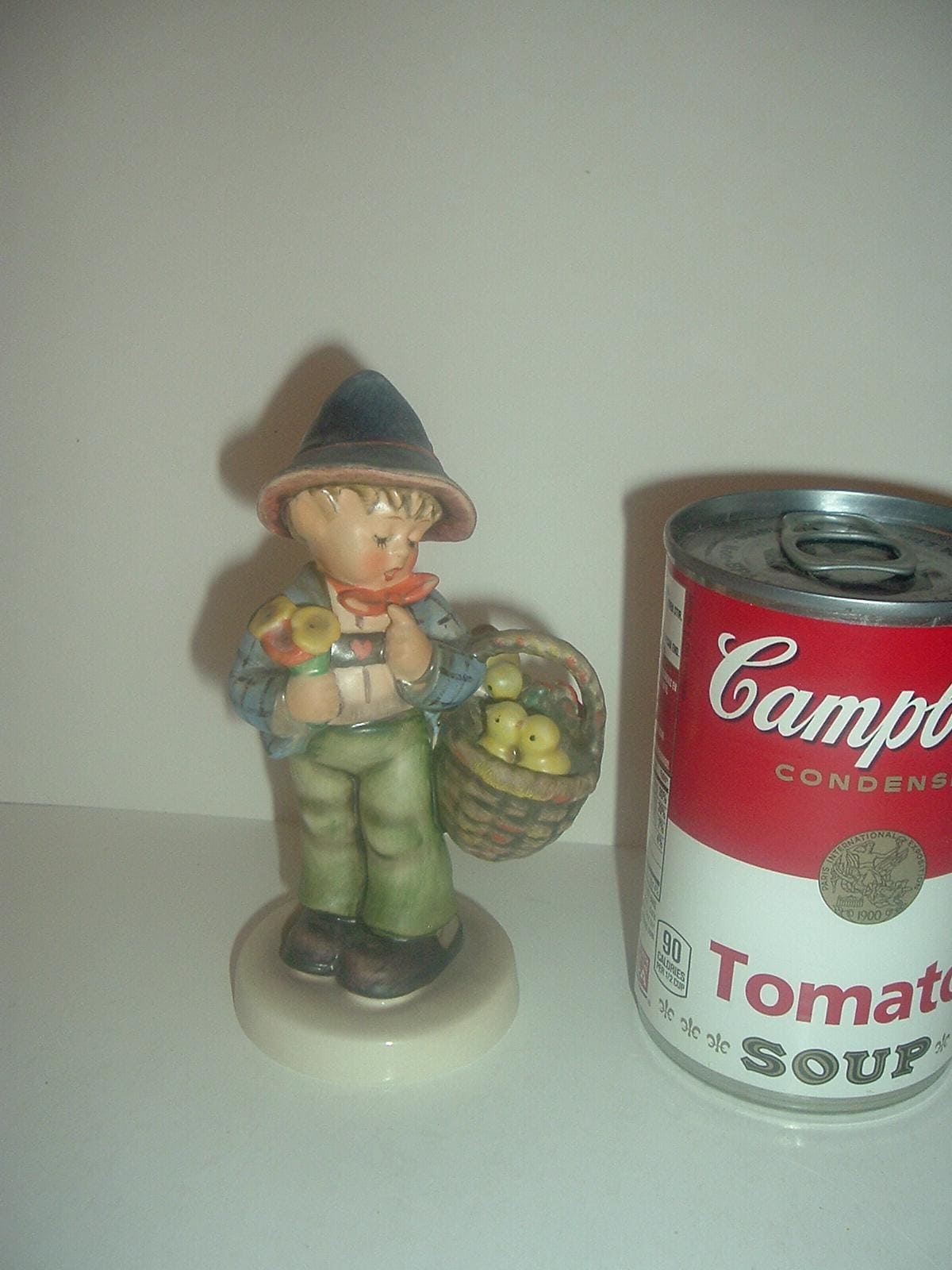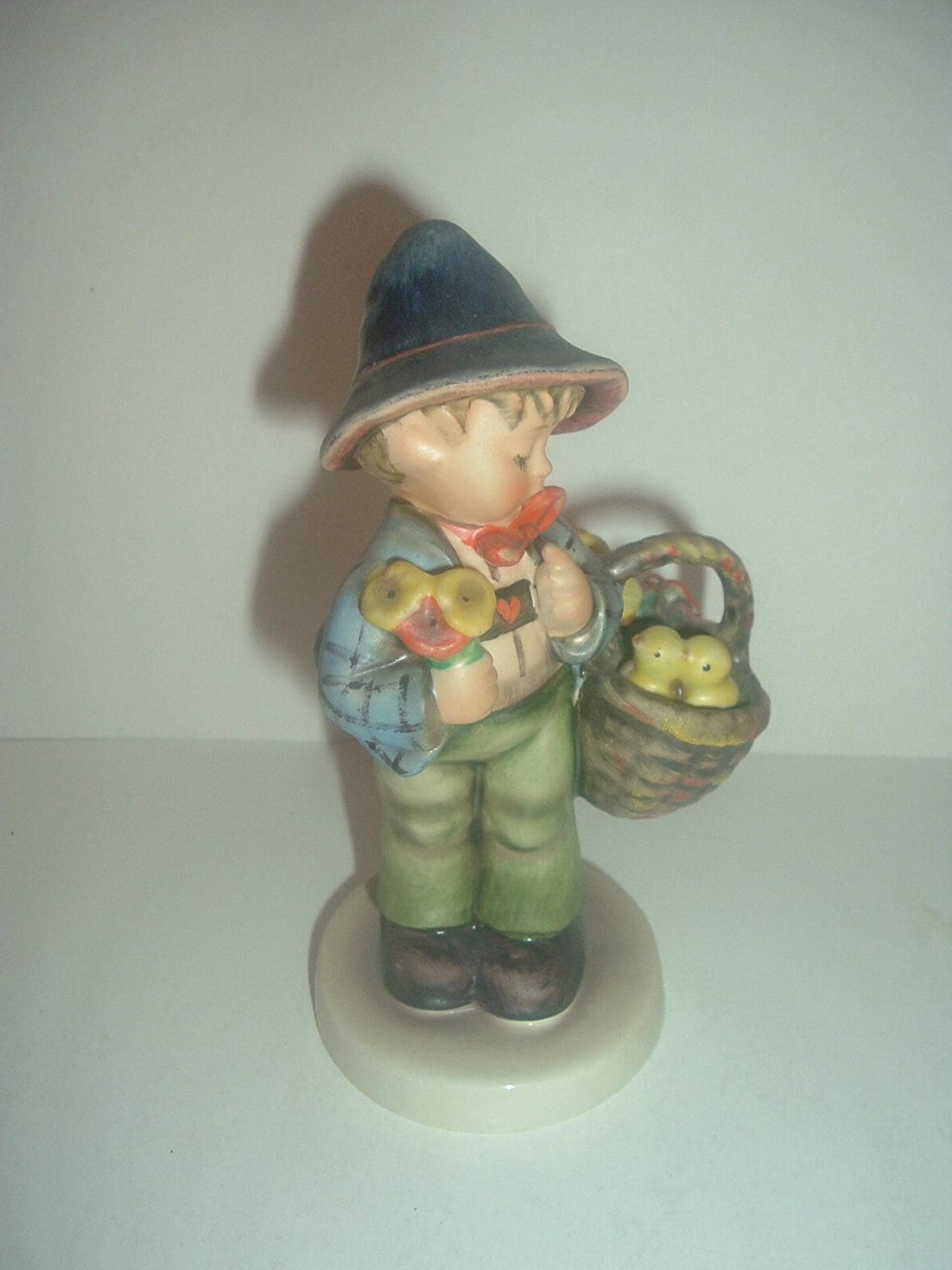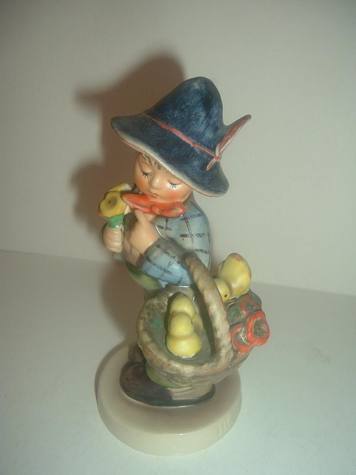 This Hummel HUM 378 Easter Greetings -- boy with chicks in basket -- figurine measures approx. 5"H. I notice a couple of fine, light craze lines on the underside bottom of the base, otherwise, he is excellent, with no chips, no cracks, and no wear. The bee in v over e mark -- TMK 5 --is on the bottom. Figurine only -- no box. A nice one! I gladly combine shipping.