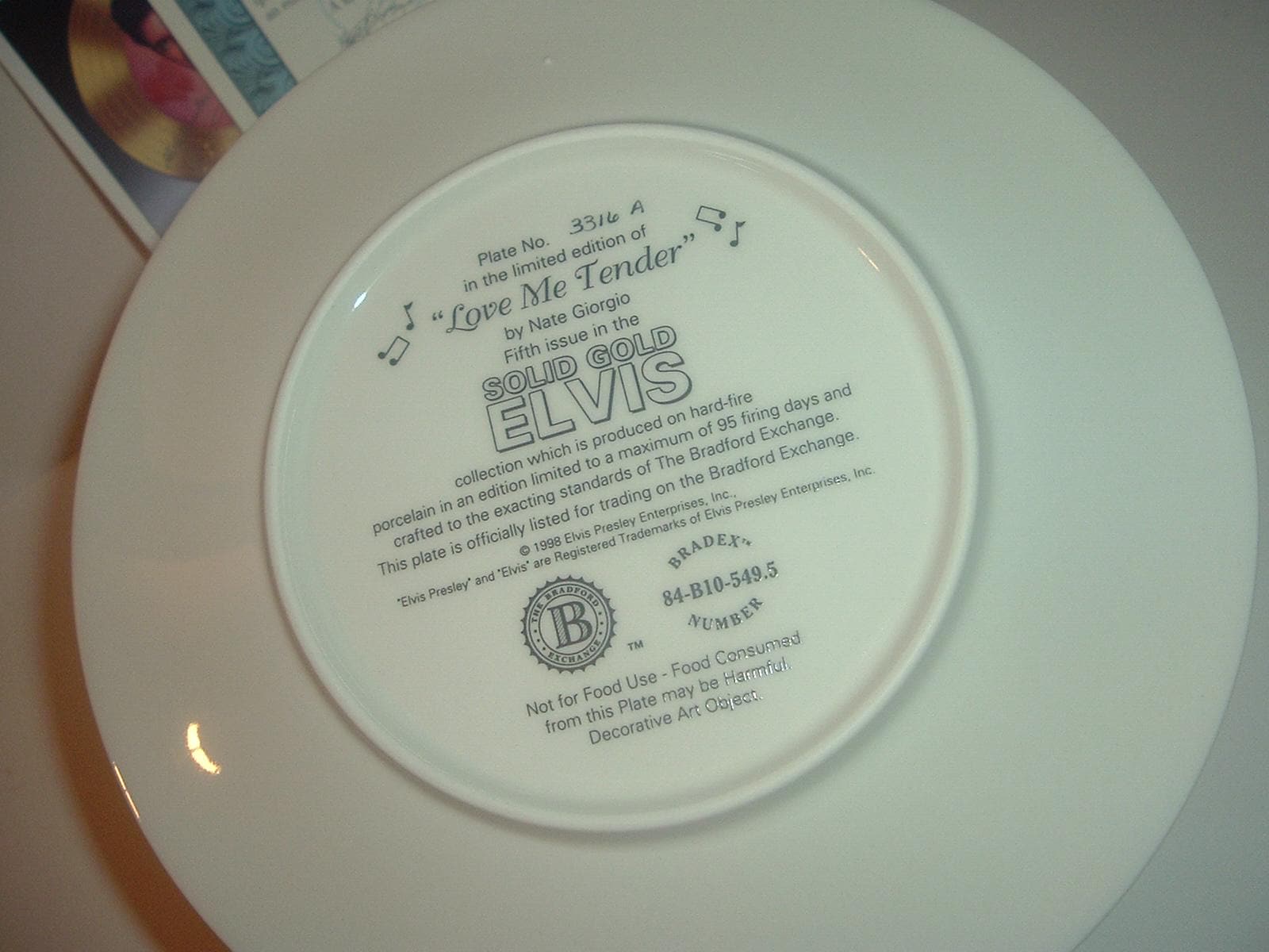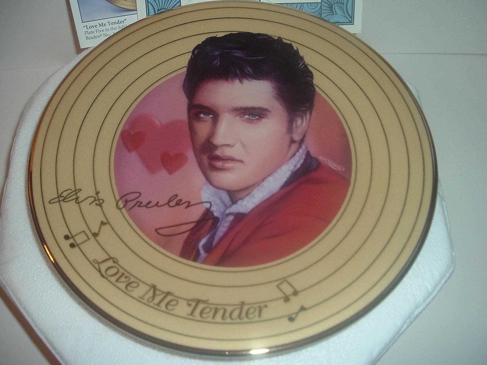 This Elvis Presley Love Me Tender plate measures approx. 8" across. It is part of a limited edition of the Solid Gold Elvis Collection, and is in excellent condition with no chips, no cracks, and no wear or scratching. It comes in its original foam "box" with its COA. Very nice! I gladly combine shipping.