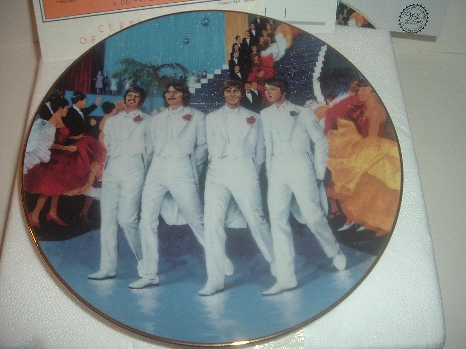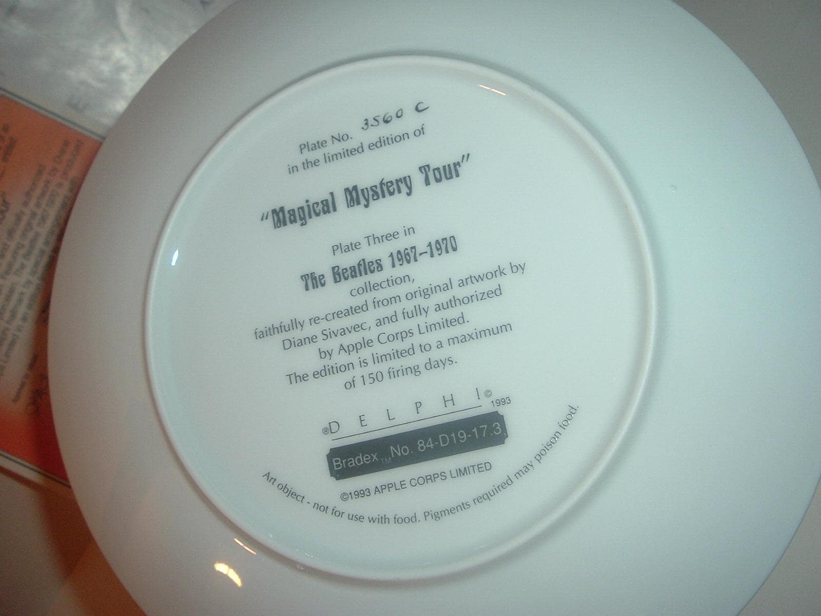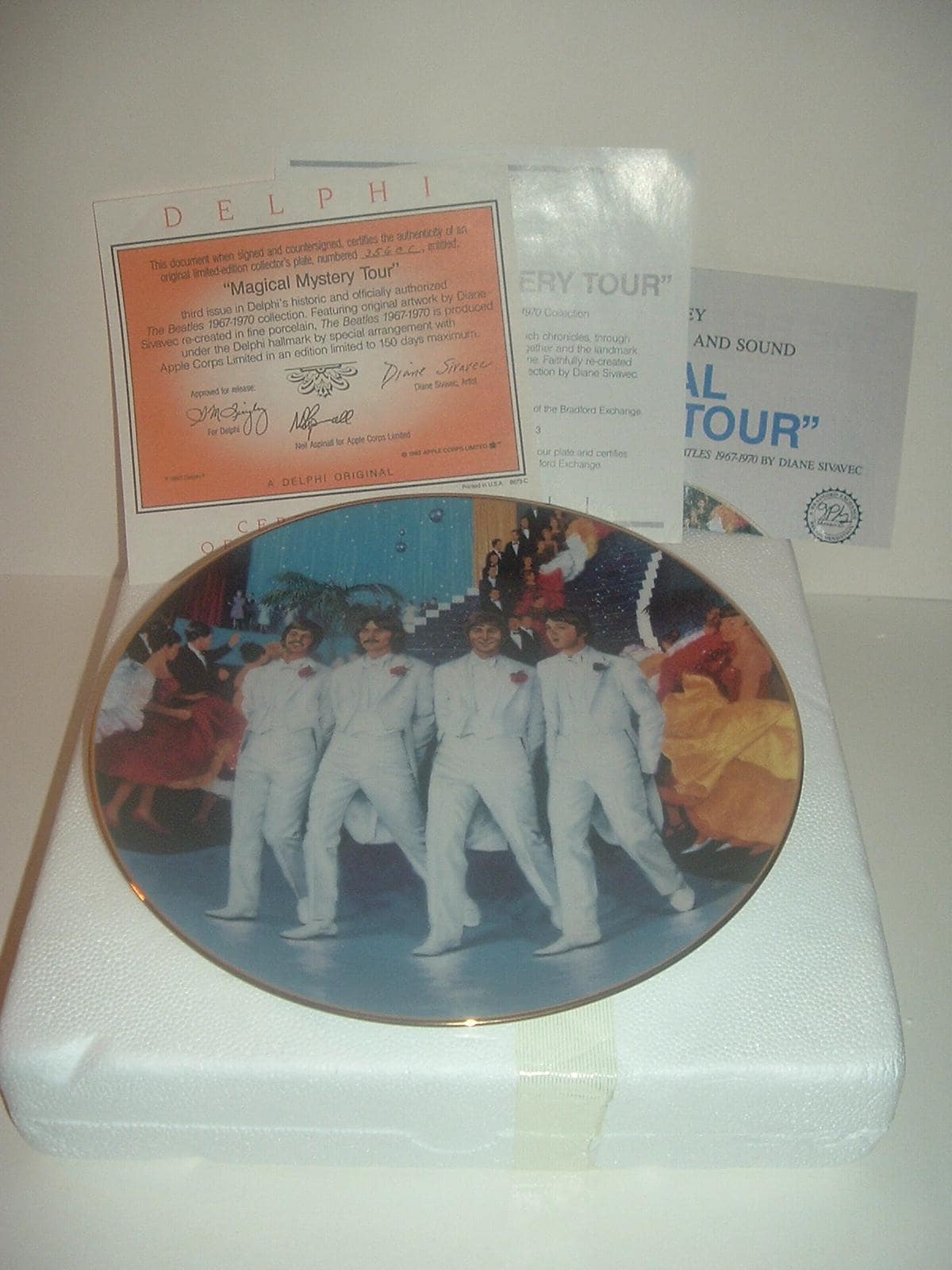 This the Beatles Magical Mystery Tour plate measures approx. 8 1/8" across. It is part of a limited edition of Delphi's The Beatles 1967 - 1970 Collection, and is in excellent condition with no chips, no cracks, and no wear or scratching. It comes in its original foam "box" with its COA. Very nice! I gladly combine shipping.