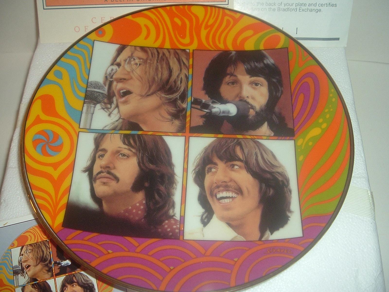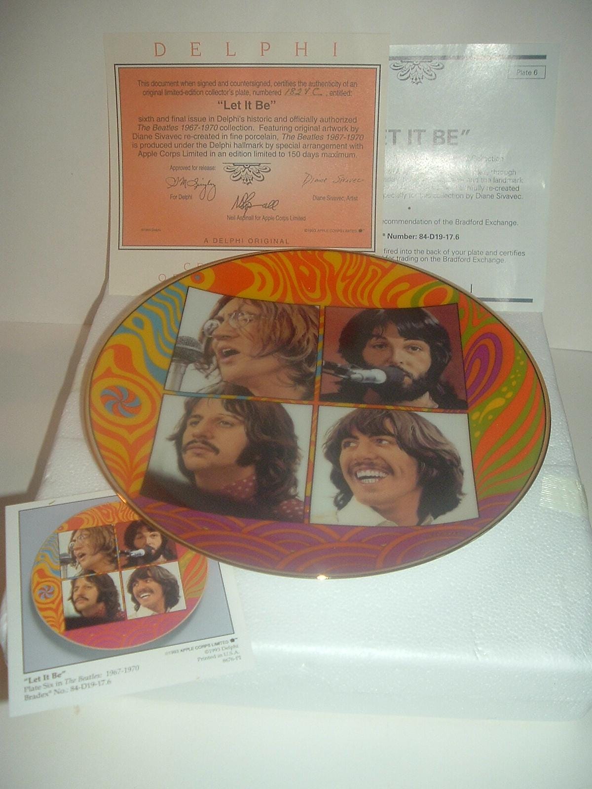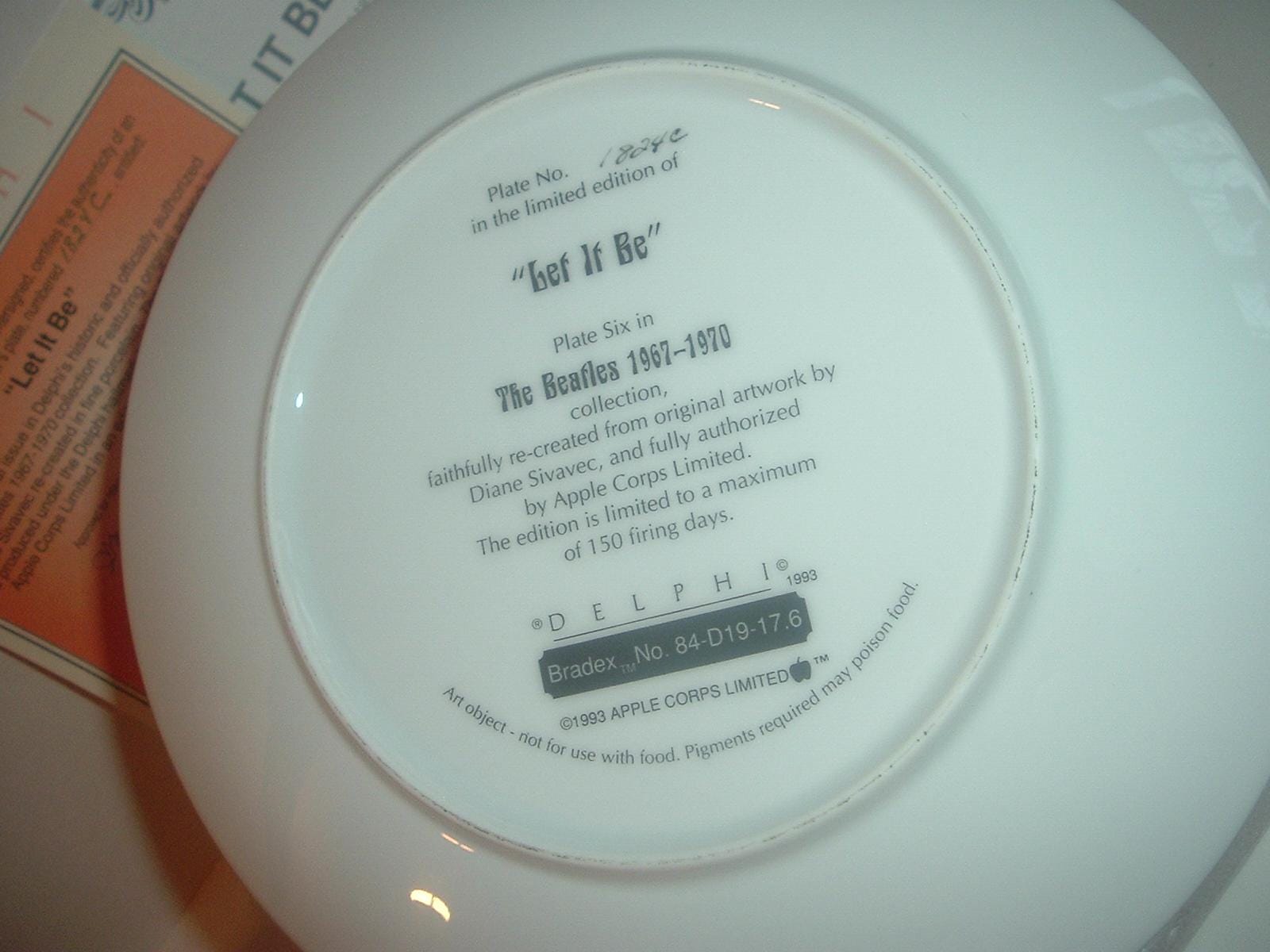 This the Beatles Let It Be plate measures approx. 8.25" across. It is part of a limited edition of Delphi's The Beatles 1967 - 1970 Collection, and is in excellent condition with no chips, no cracks, and no wear or scratching. It comes in its original foam "box" with its COA. Very nice! I gladly combine shipping.