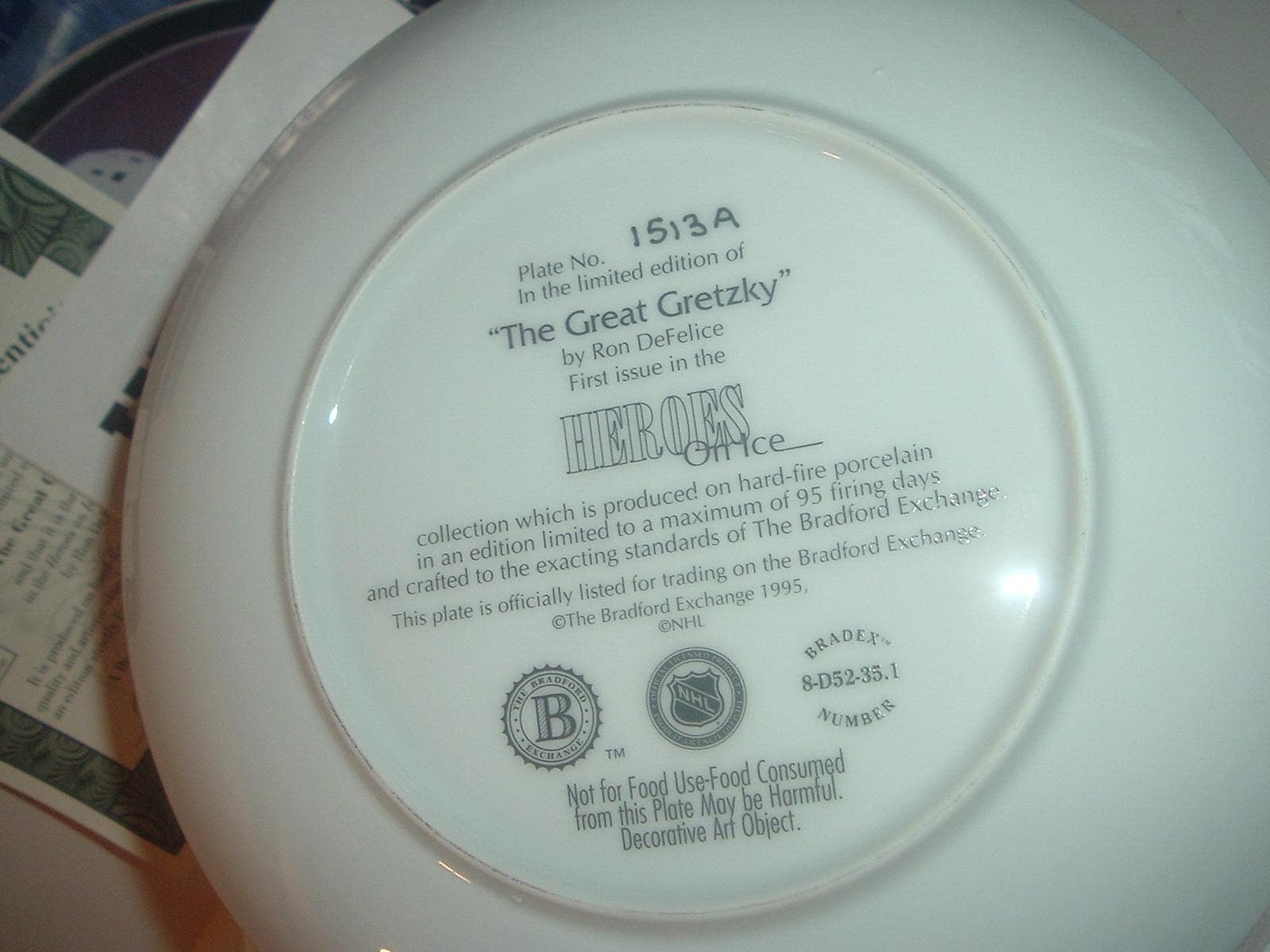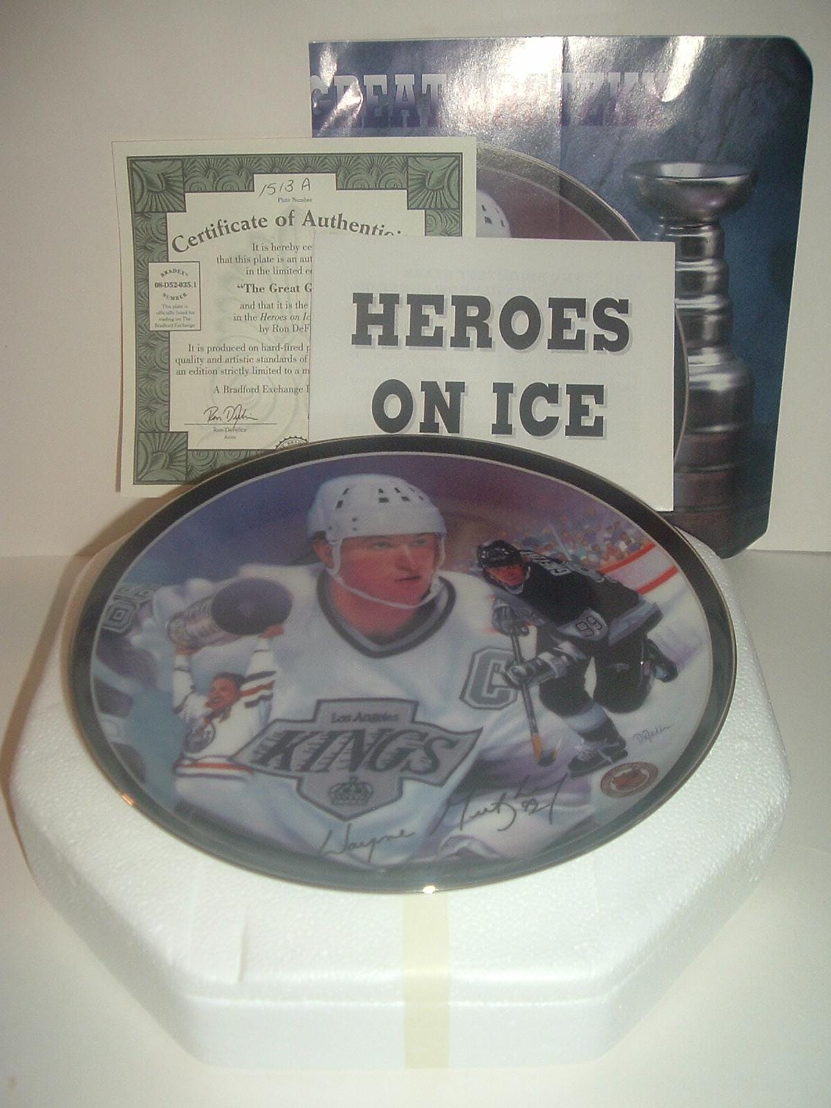 This The Great Gretzky plate measures approx. 8" across. It was the first issue in the Heroes on Ice collection, and is in excellent condition with no chips, no cracks, and no wear or scratching. It comes in its original foam "box" with its COA. Very nice! I gladly combine shipping.