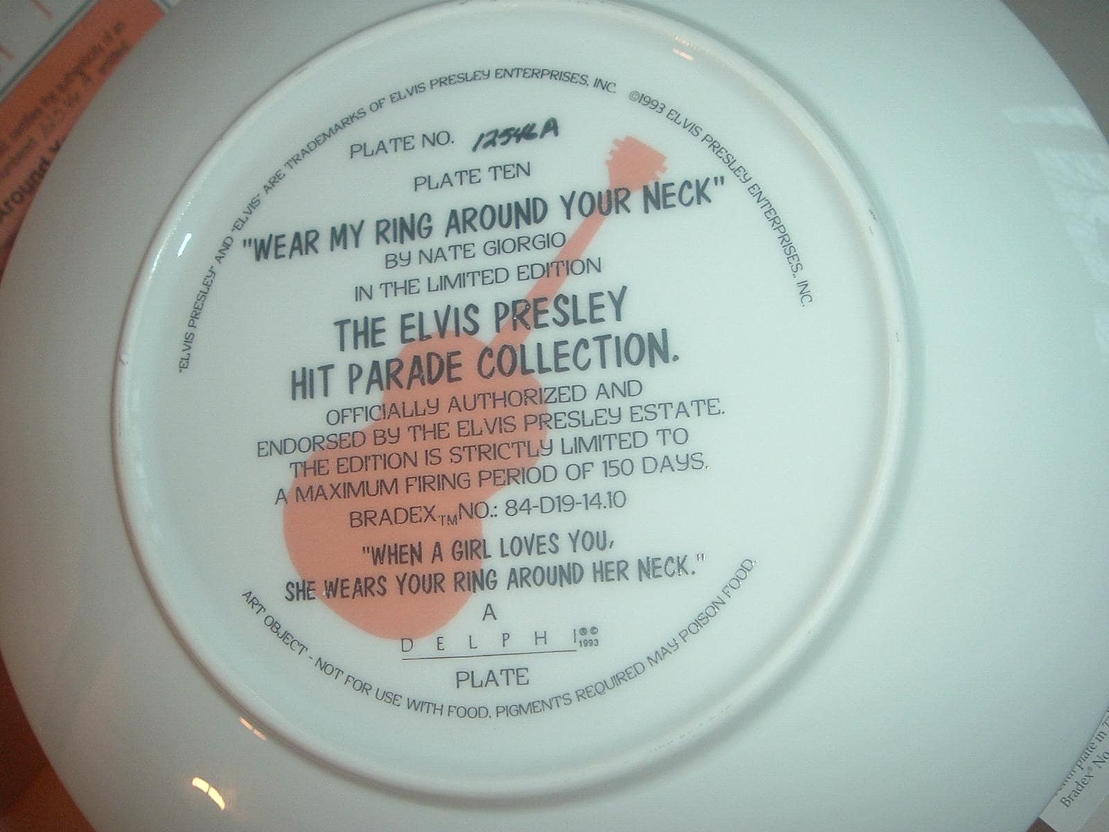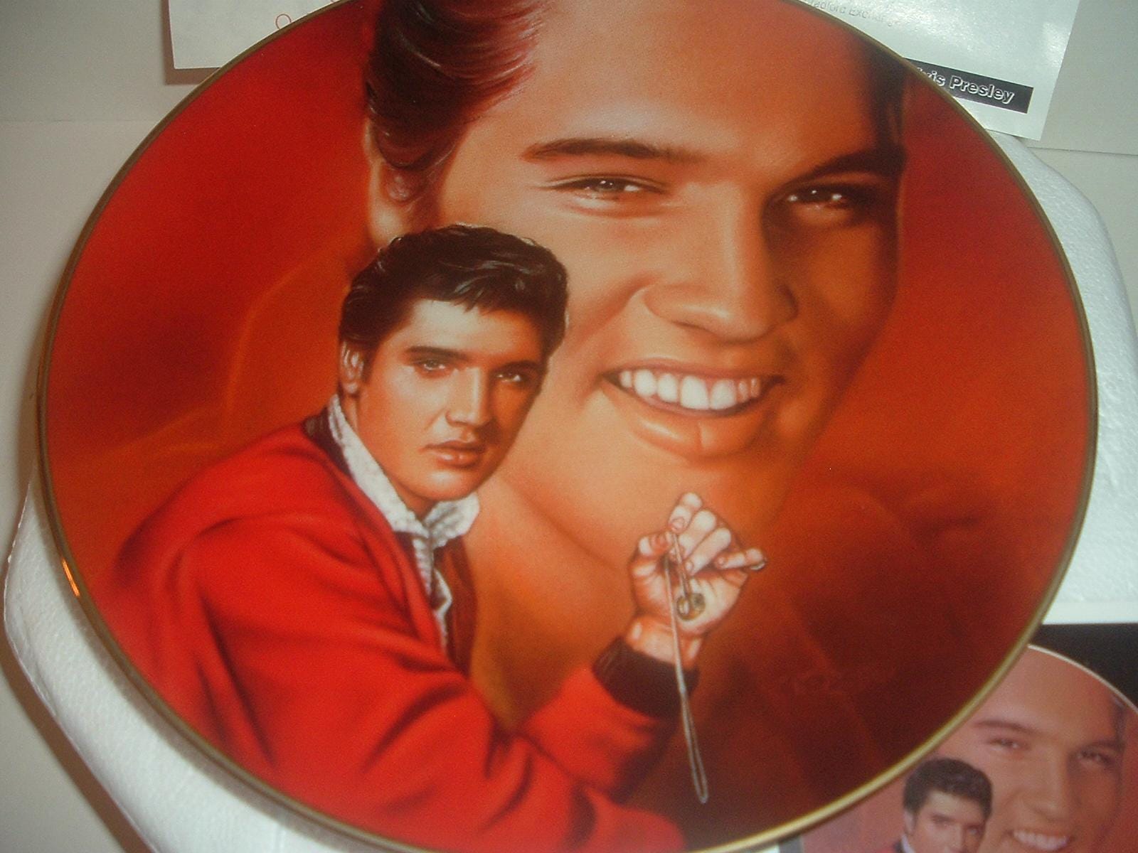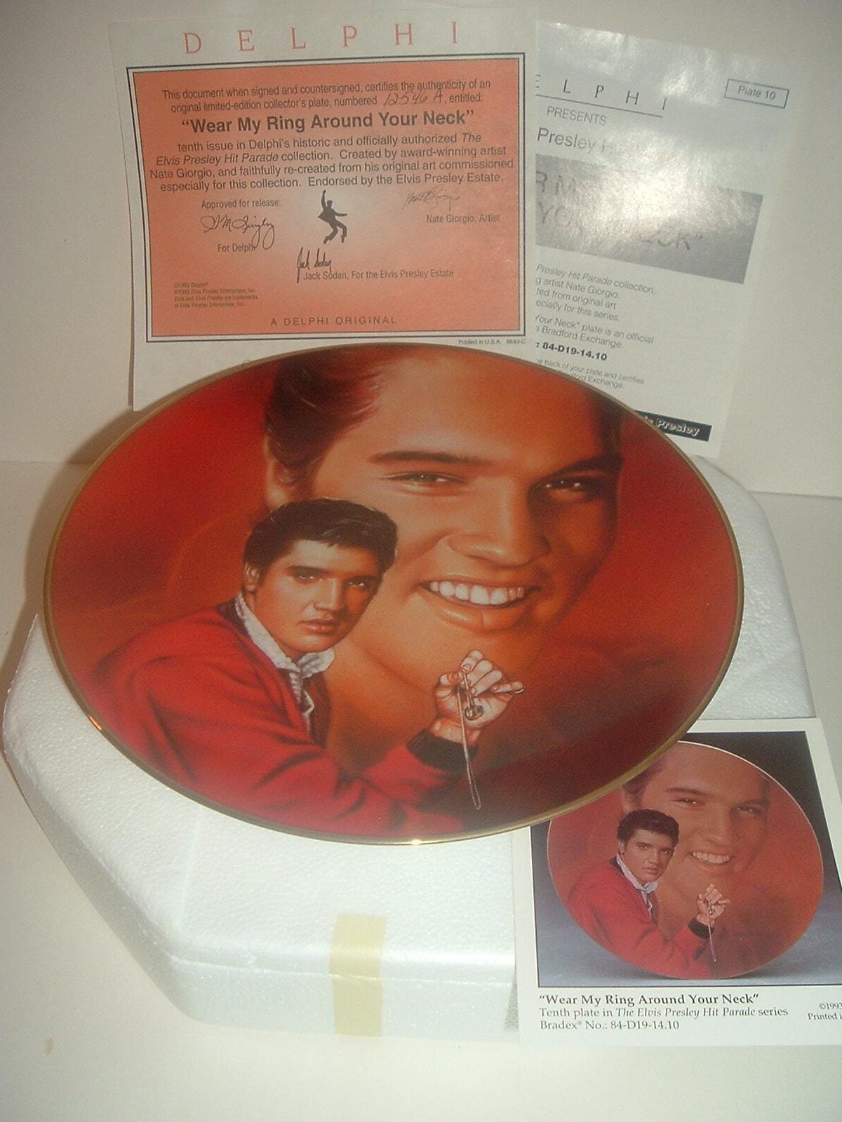 This Elvis Presley "Wear My Ring Around Your Neck" plate measures approx. 8 1/8" across. It is part of a limited edition of the Elvis Presley Hit Parade Collection, and is in excellent condition with no chips, no cracks, and no wear or scratching. It comes in its original foam "box" with its COA. Very nice! I gladly combine shipping.