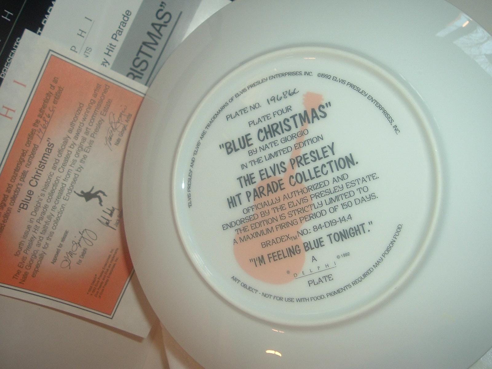 This Elvis Presley "Blue Christmas" plate measures approx. 8" across. It is part of a limited edition of the Elvis Presley Hit Parade Collection, and is in excellent condition with no chips, no cracks, and no wear or scratching. It comes in its original foam "box" with its COA. Very nice! I gladly combine shipping.