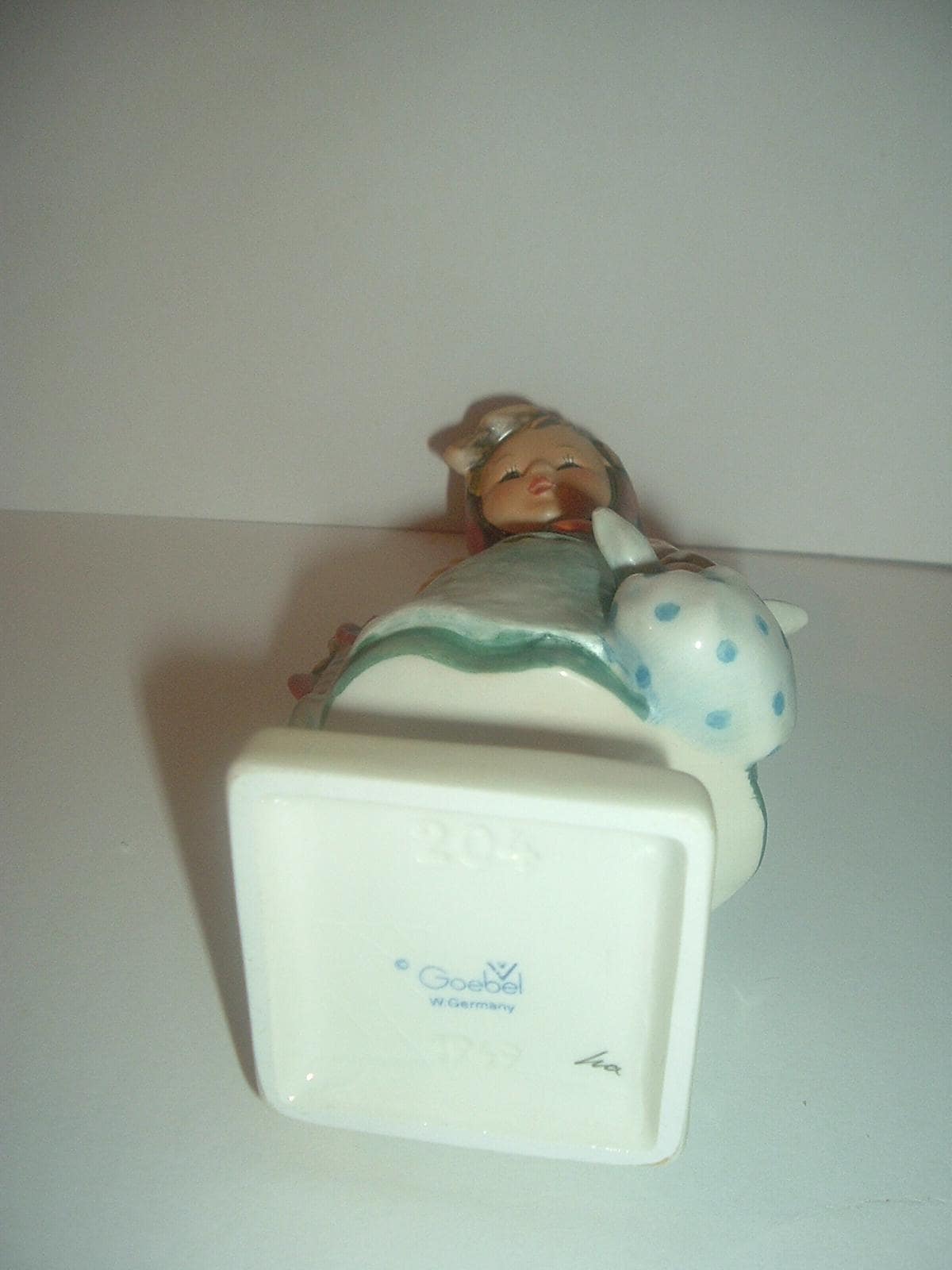 This Hummel HUM 204 Weary Wanderer girl figurine measures approx. 5 5/8"H. I do notice a little fine, light crazing on the underside of base. Otherwise, it is excellent, with no chips, no cracks, and no wear. The b in V over e -- TMK 5 -- mark is on the bottom. Figurine only -- no box. A nice one! I gladly combine shipping.