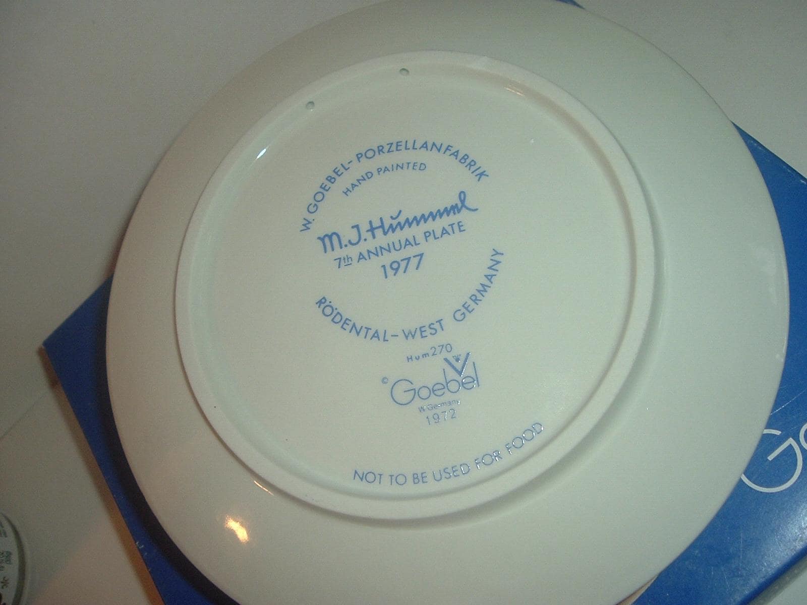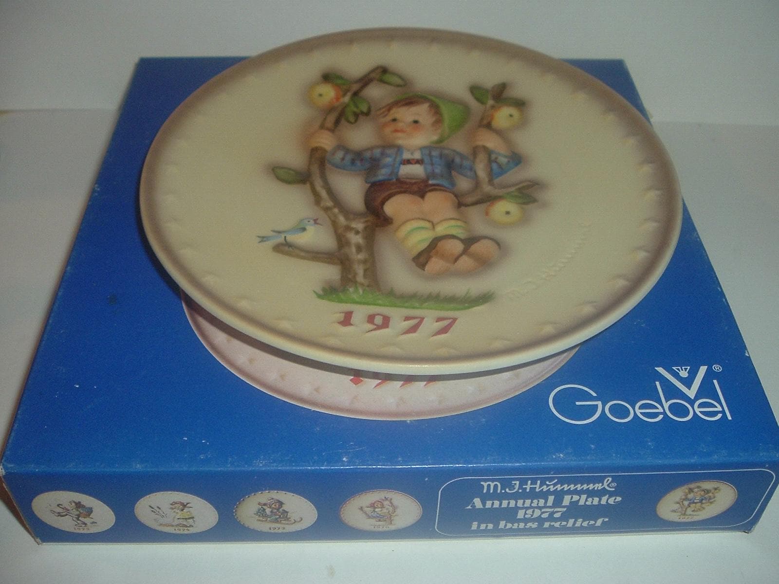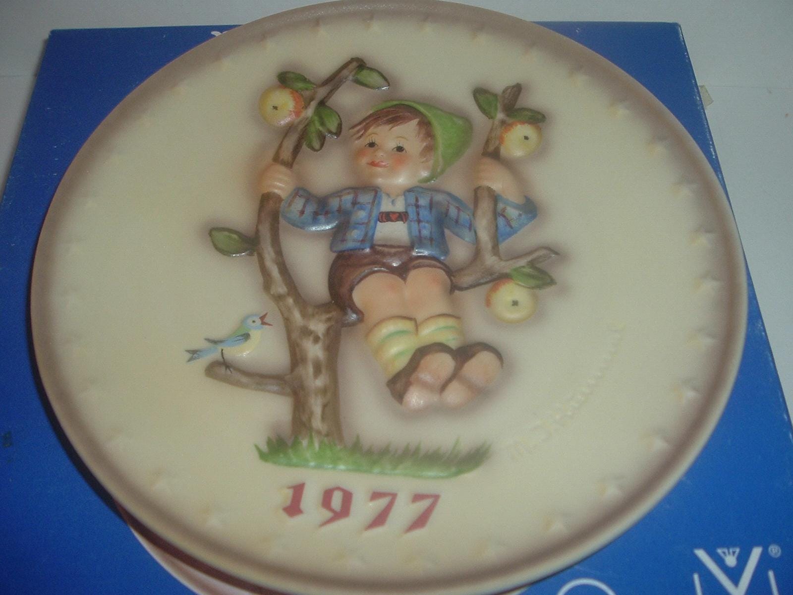 This 1977 Hummel Annual Plate -- featuring the apple tree boy -- measures approx. 7.5" across. It is in excellent condition with no chips, no cracks, and no wear or scratching. Box is in pretty good shape with some shelf wear. Very nice! I gladly combine shipping.
