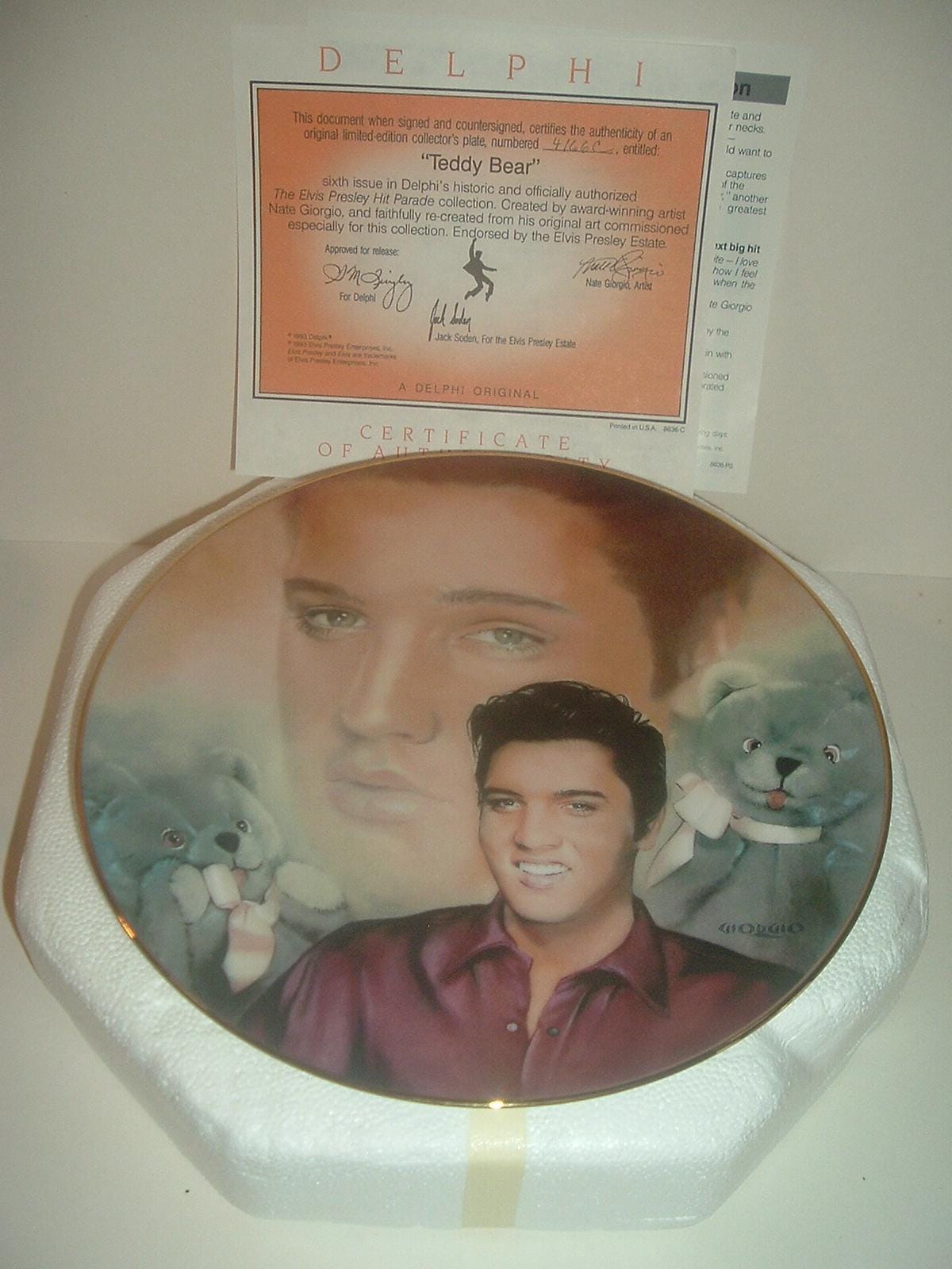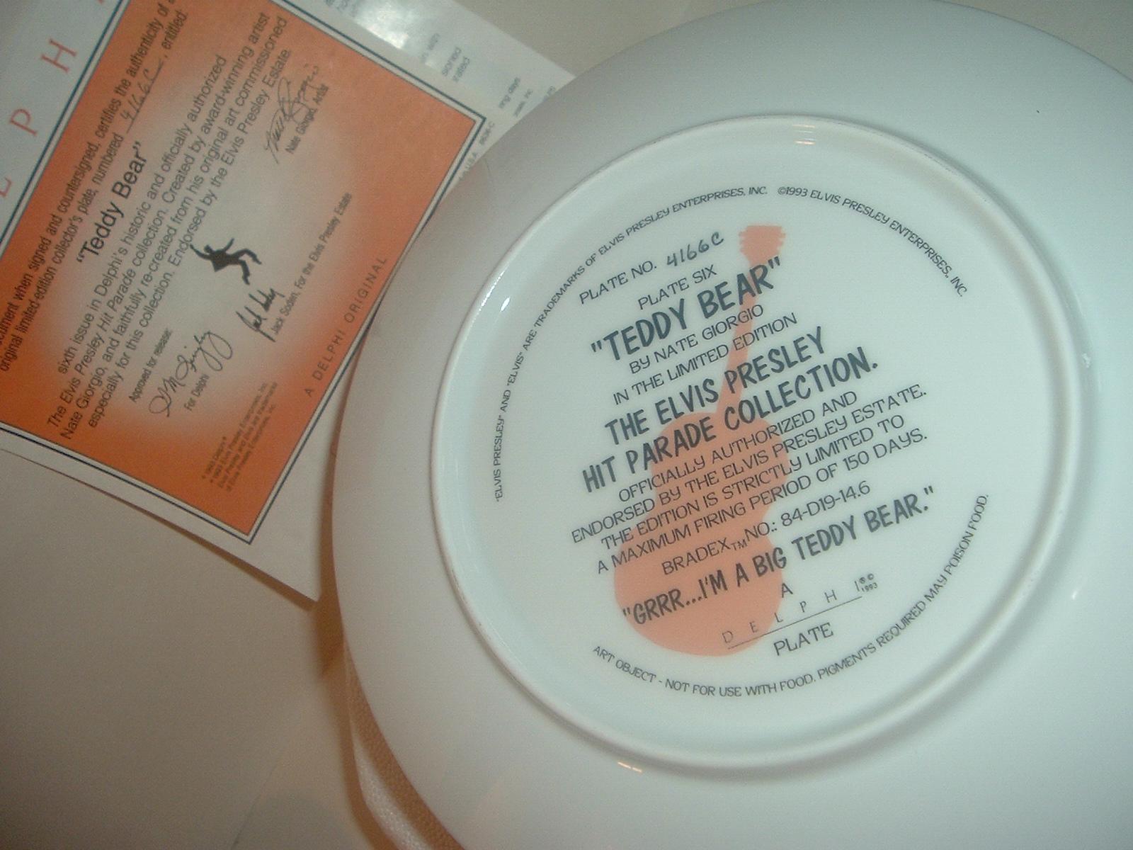 This Elvis Presley "Teddy Bear" plate measures approx. 8" across. It is part of a limited edition of the Elvis Presley Hit Parade Collection, and is in excellent condition with no chips, no cracks, and no wear or scratching. It comes in its original foam "box" with its COA. Very nice! I gladly combine shipping.