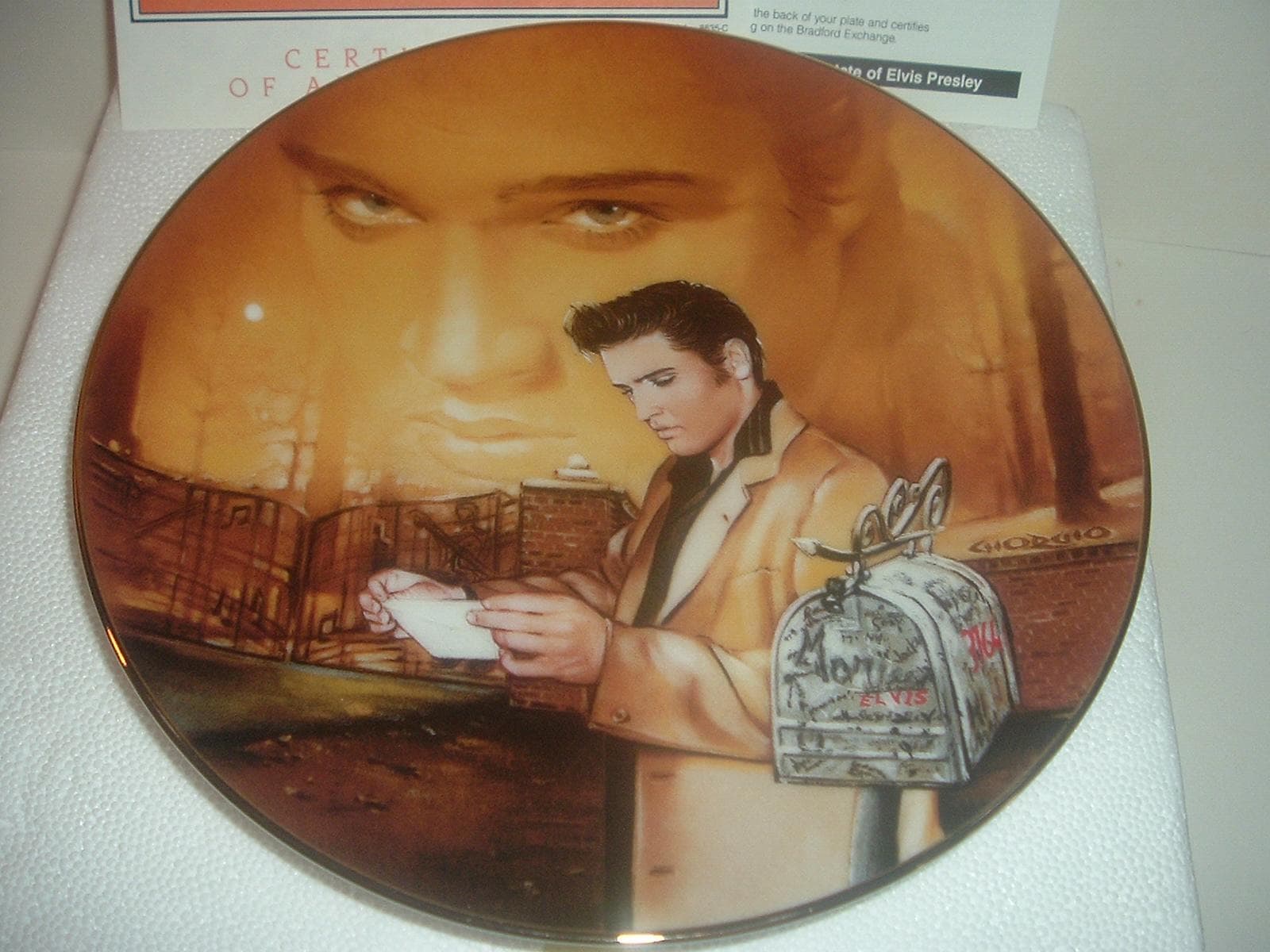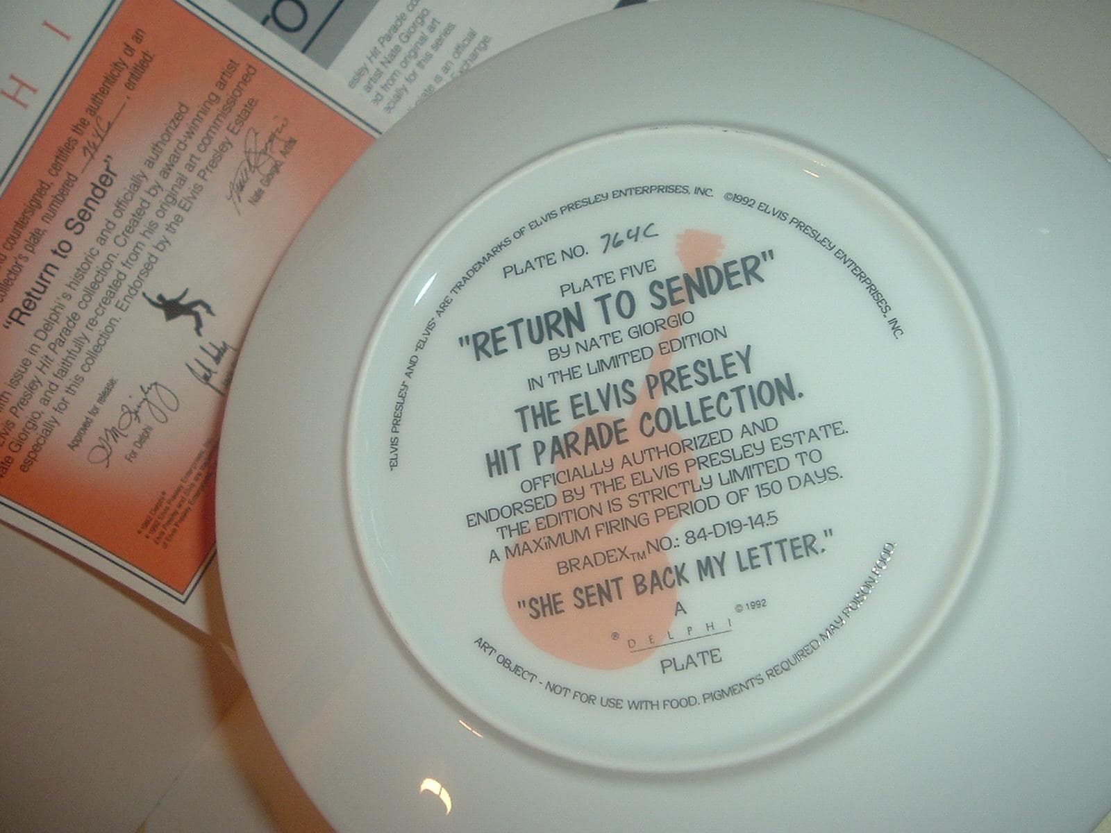 This Elvis Presley "Return To Sender" plate measures approx. 8" across. It is part of a limited edition of the Elvis Presley Hit Parade Collection, and is in excellent condition with no chips, no cracks, and no wear or scratching. It comes in its original foam "box" with its COA. Very nice! I gladly combine shipping.