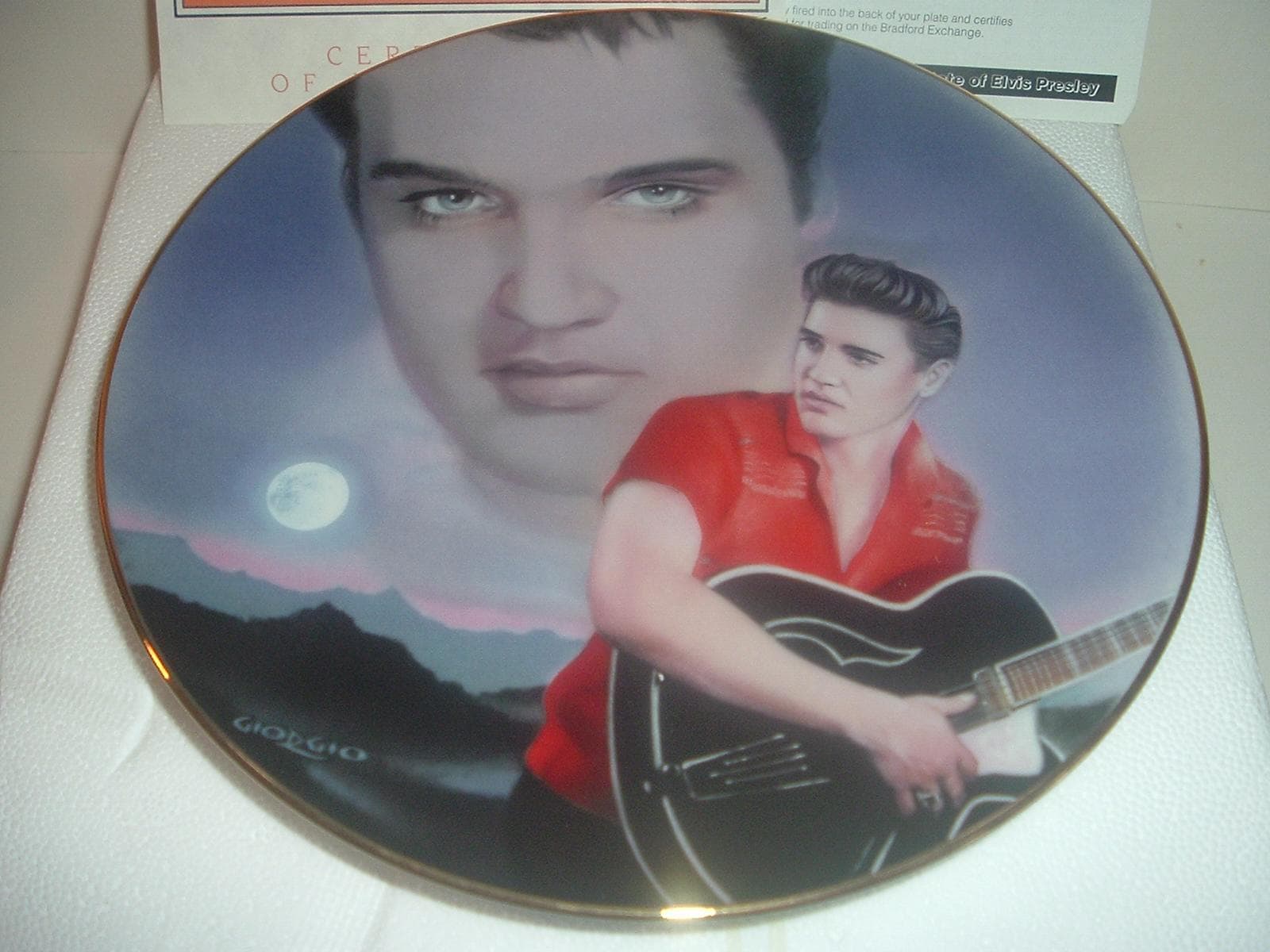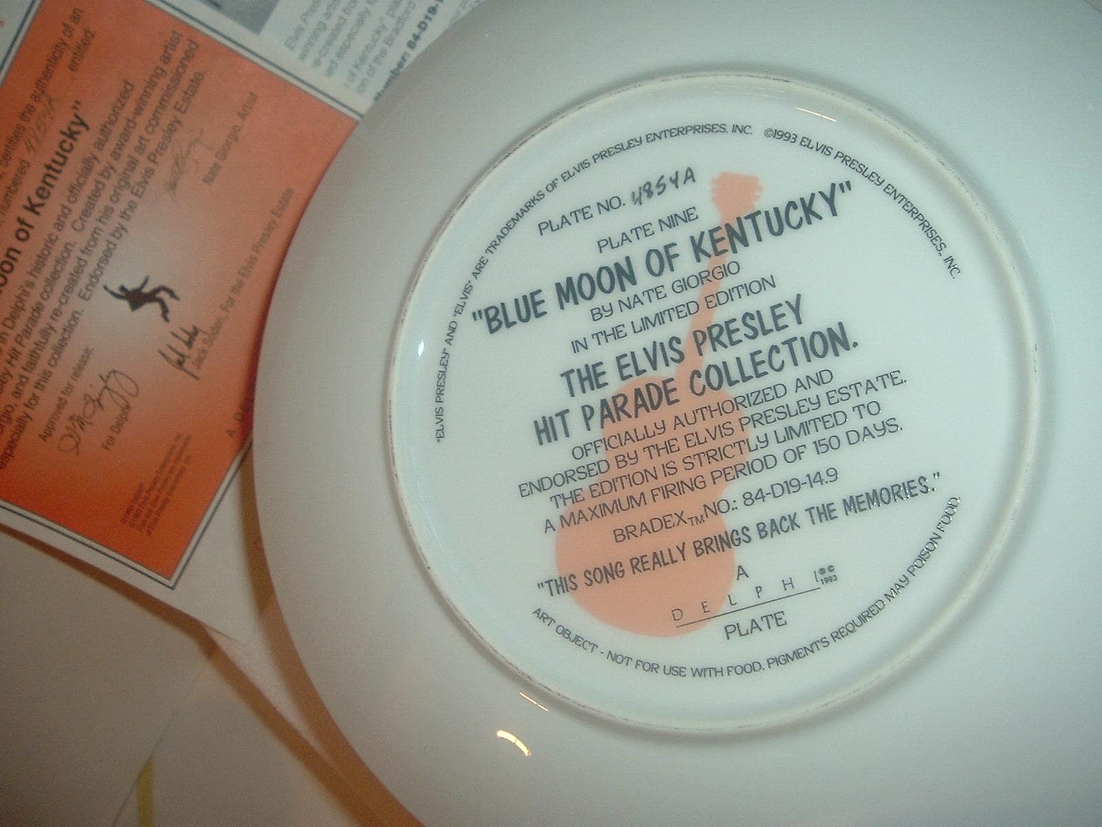 This Elvis Presley "Blue Moon Over Kentucky" plate measures approx. 8" across. It is part of a limited edition of the Elvis Presley Hit Parade Collection, and is in excellent condition with no chips, no cracks, and no wear or scratching. It comes in its original foam "box" with its COA. Very nice! I gladly combine shipping.