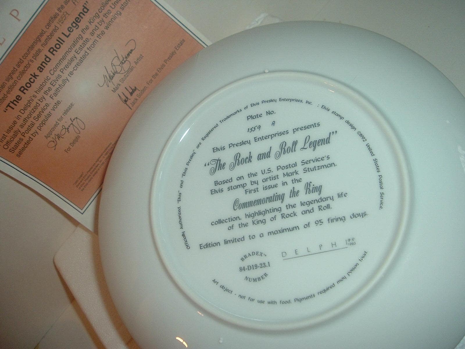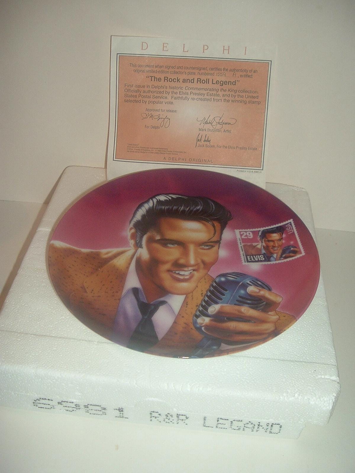 This Elvis Presley "The Rock and Roll Legend" plate measures approx. 8" across. It is part of a limited edition of the Elvis Presley Hit Parade Collection, and is in excellent condition with no chips, no cracks, and no wear or scratching. It comes in its original foam "box" with its COA. I notice a foam chip on the foam box in one corner (can be seen in photo 1 to the right of the word "legend". Plate is absolutely excellent, though. Very nice! I gladly combine shipping.