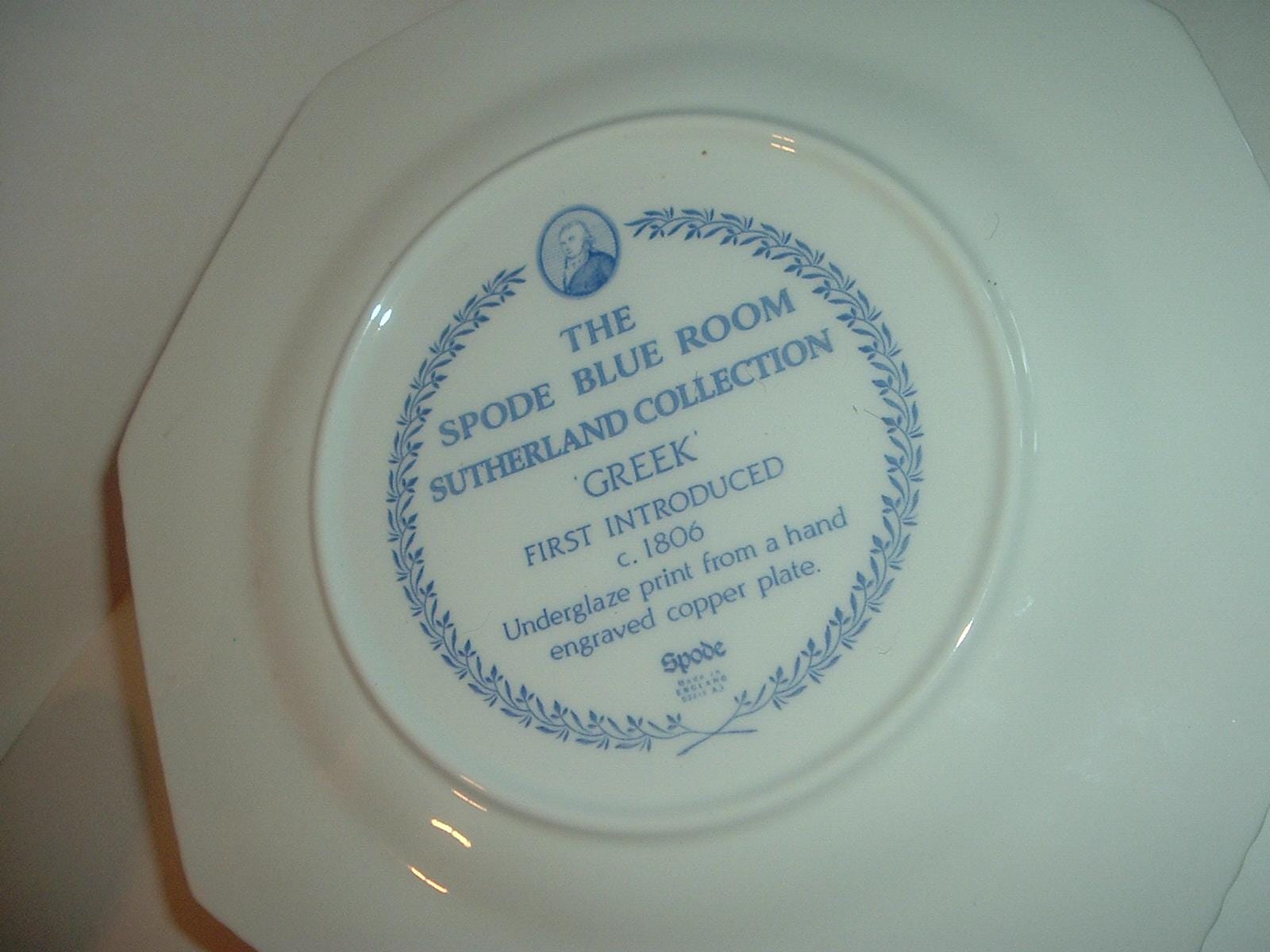 This Spode Blue Room "Greek" plate measures approx. 9 3/8" across. It was part of the Blue Room Sutherland Collection, and is excellent with no chips, no cracks, and no wear or scratching. No box -- plate only. A nice piece! I gladly combine shipping.