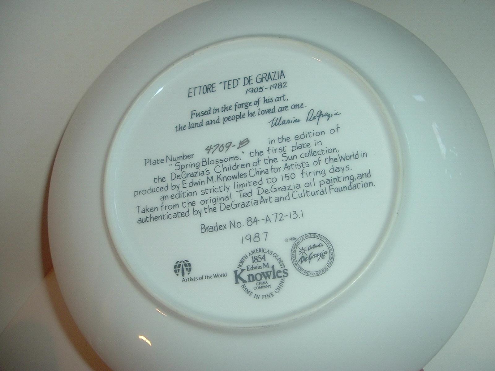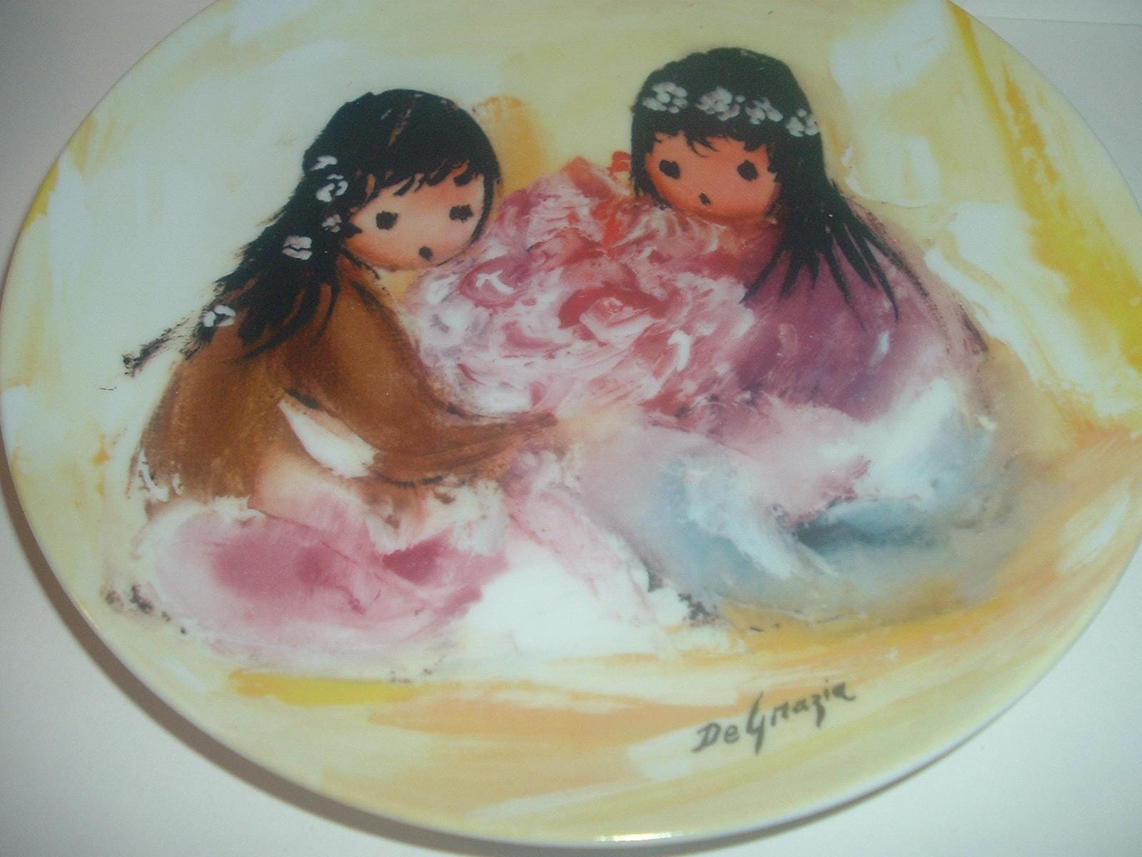 This "Spring Blossoms" plate measures approx. 8 3/8" across. It was the first issue in the DeGrazia's Children of the Sun collection , and is excellent with no chips, no cracks, and no wear or scratching. No box -- plate only. Part of a limited edition. A nice piece! I gladly combine shipping.