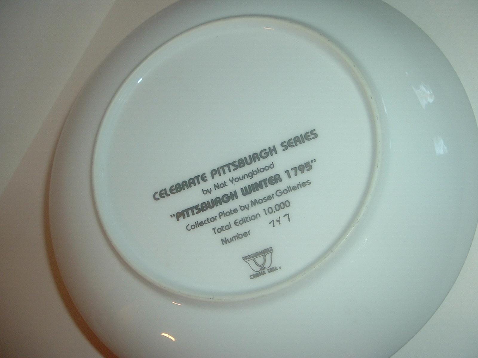 This Nat Youngblood "Pittsburgh Winter 1795" plate measures approx. 8 3/8" across. It is excellent with no chips, no cracks, and no wear or scratching. No box -- plate only. Part of a limited edition. A nice piece! I gladly combine shipping.