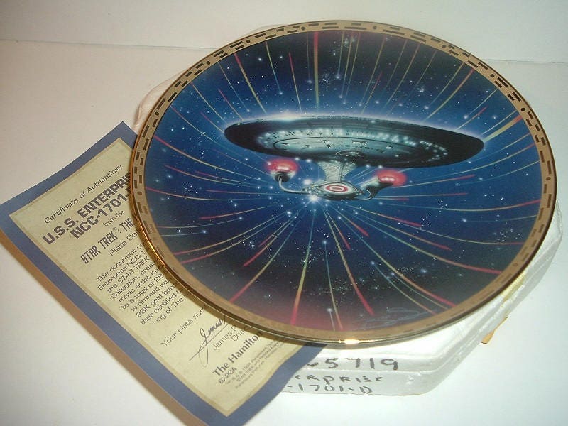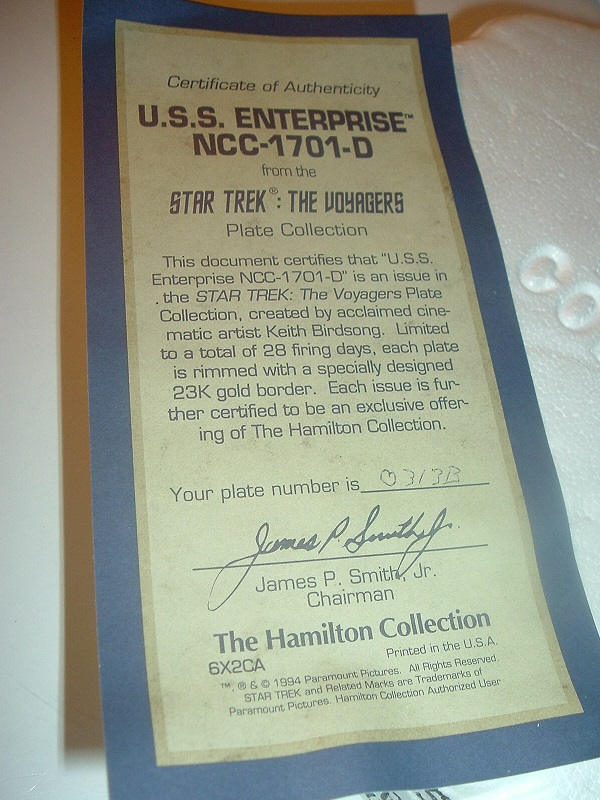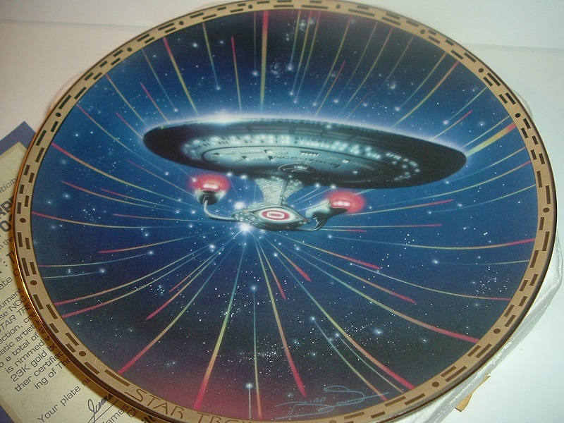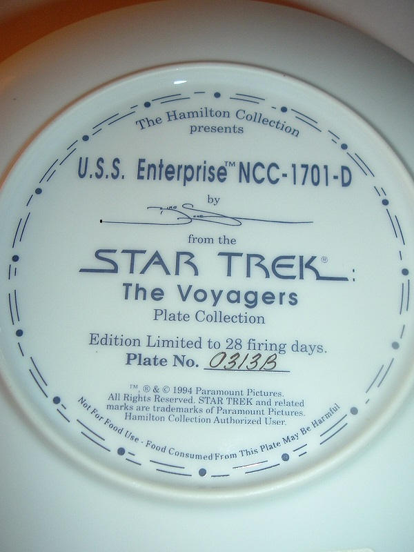 This 1994 Star Trek USS Enterprise NCC-1701-D plate measures approx. 8 1/8" across. It is part of Hamilton's Star Trek The Voyagers Collection by Keith Birdsong, and is in excellent condition. It is in its original foam with its COA (Certificate of Authenticity). Foam container is in fair condition. COA is still in good shape. A nice Star Trek collectible! I gladly combine shipping.