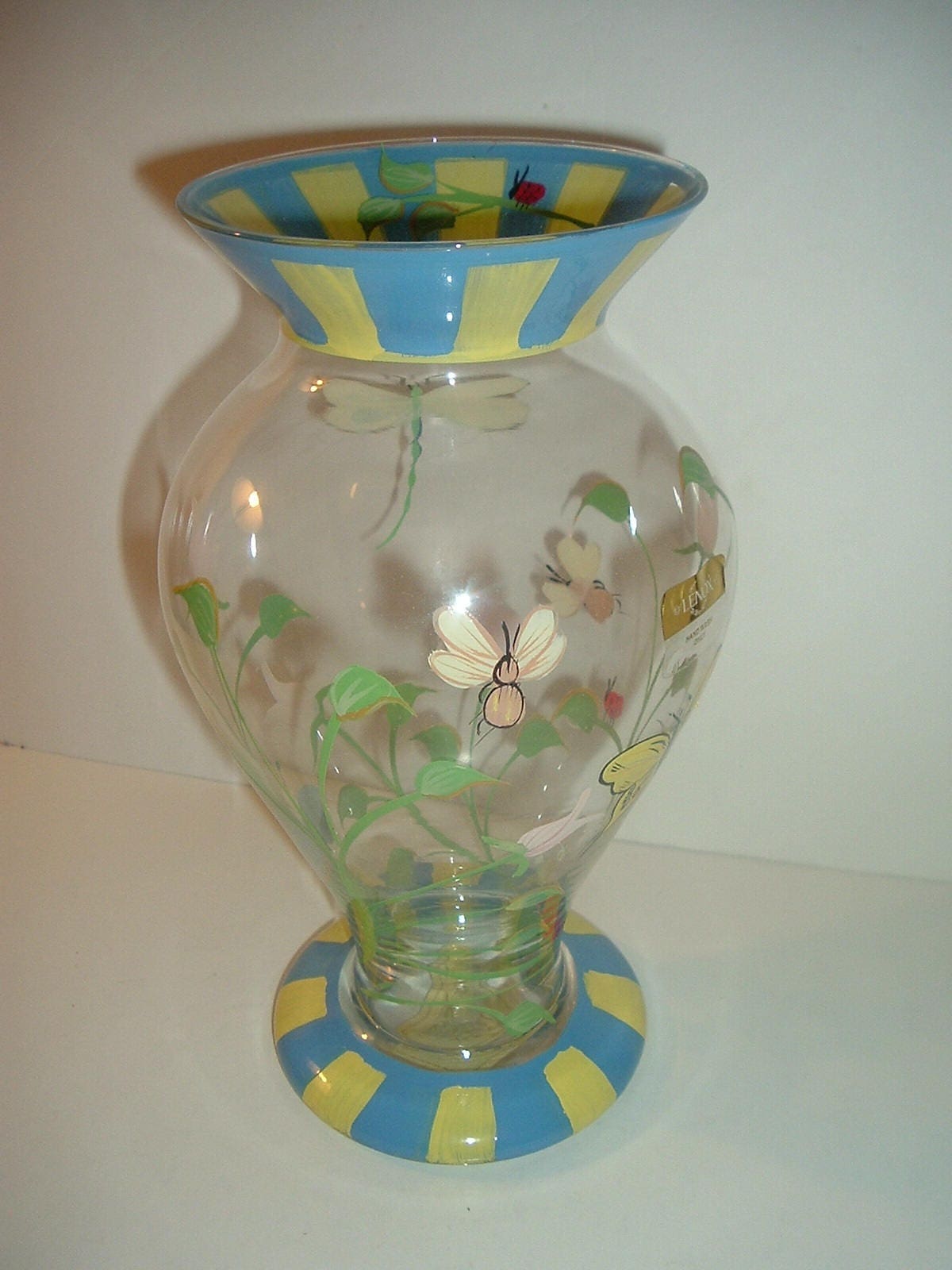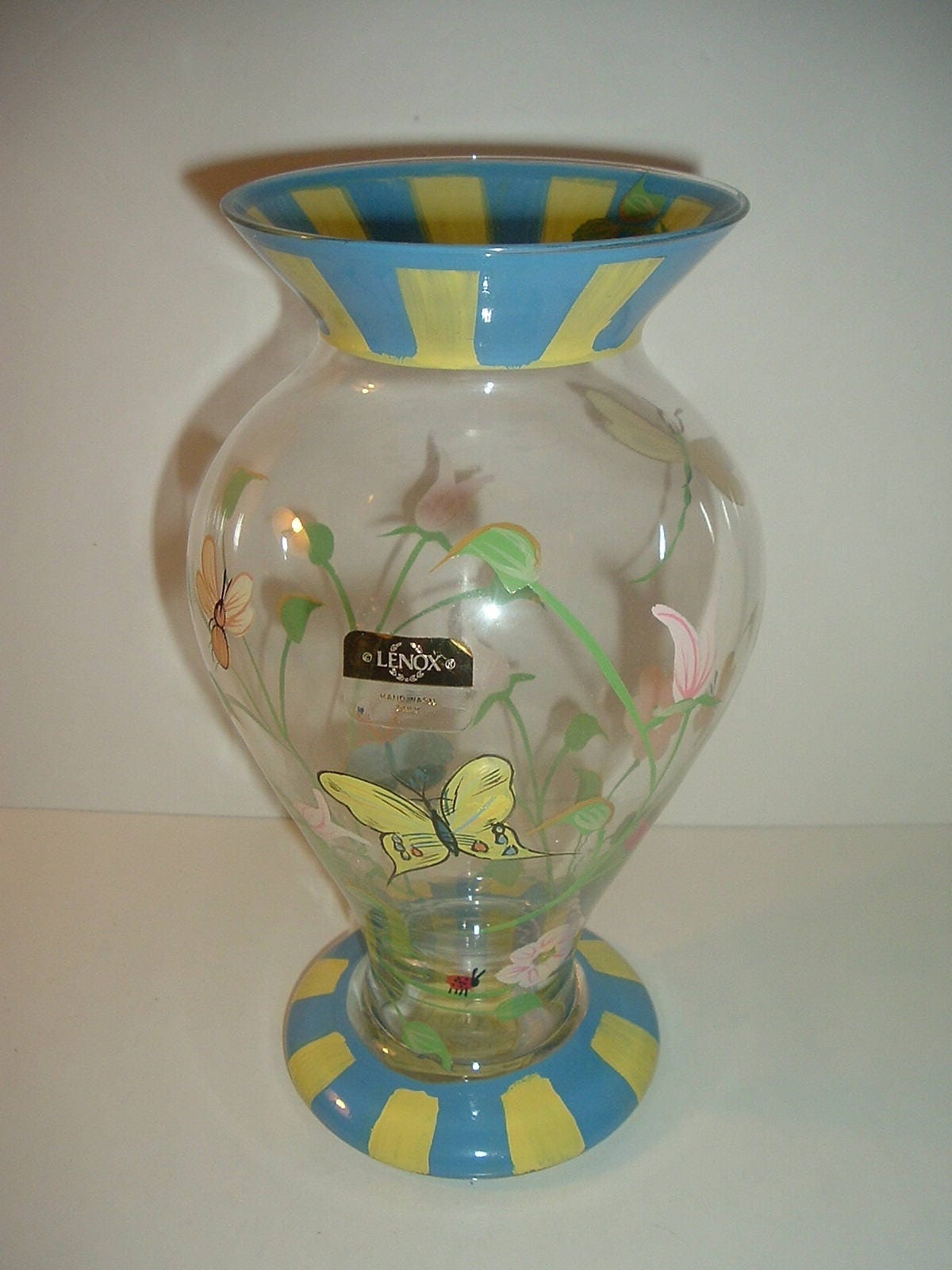This Lenox Butterfly Meadow glass vase measures approx. 9.5"H. It is excellent with no chips or cracks. The painting is in excellent condition too. It comes in its original box -- box is also in good shape. Nice! I gladly combine shipping.
