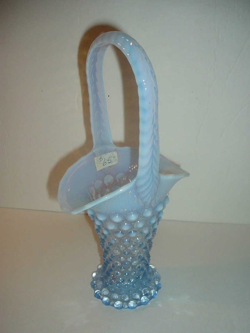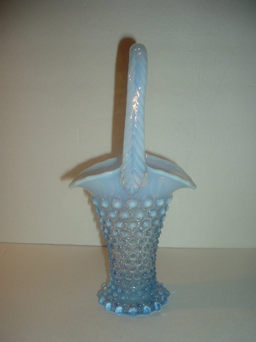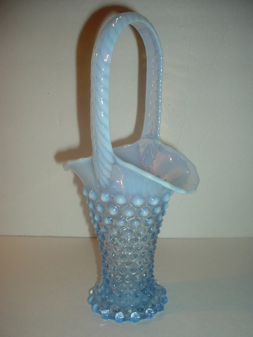 This blue opalescent Hobnail pattern glass basket measures approx. 10"H including handle, and 4.75" by 3 1/8" measured each way straight across the top rim. It is light blue opalescent with a Hobnail body and an opalescent applied handle. It is excellent with no chips or cracks. It's an old piece -- I think it may be Duncan & Miller. It is from a closed shop, and their $65 price tag is still on it. A nice piece! I gladly combine shipping.