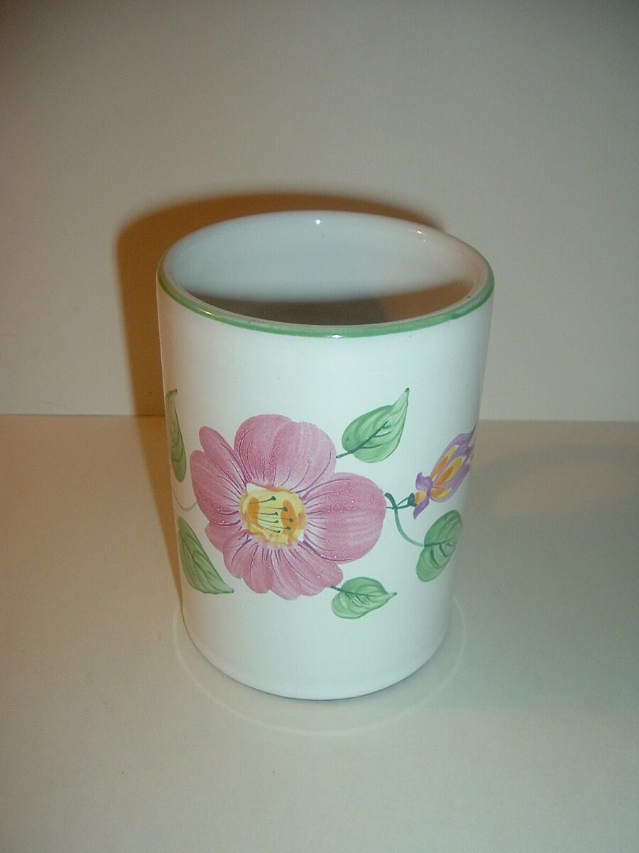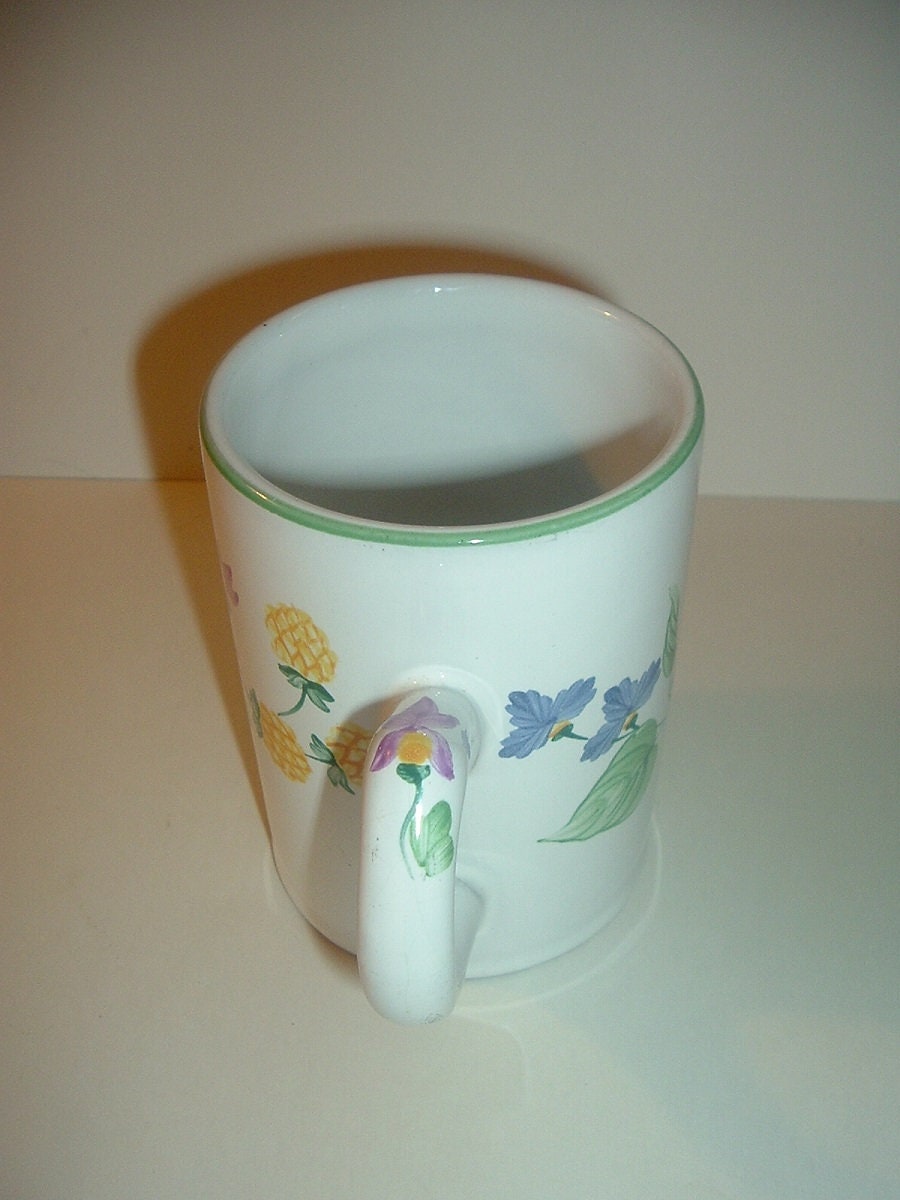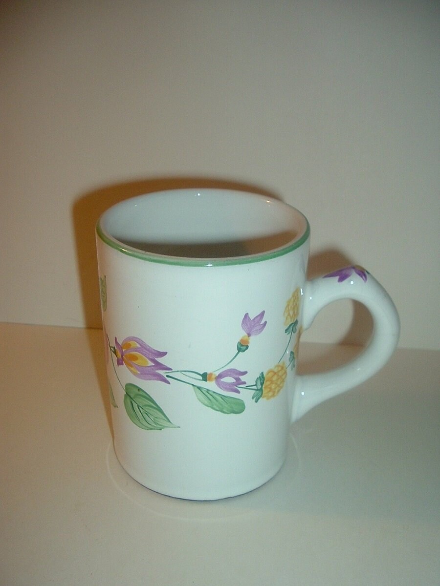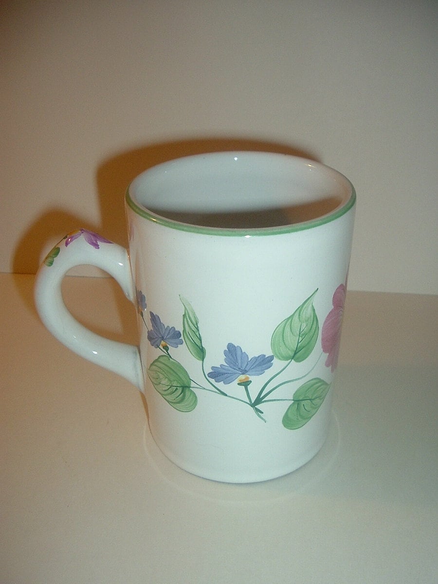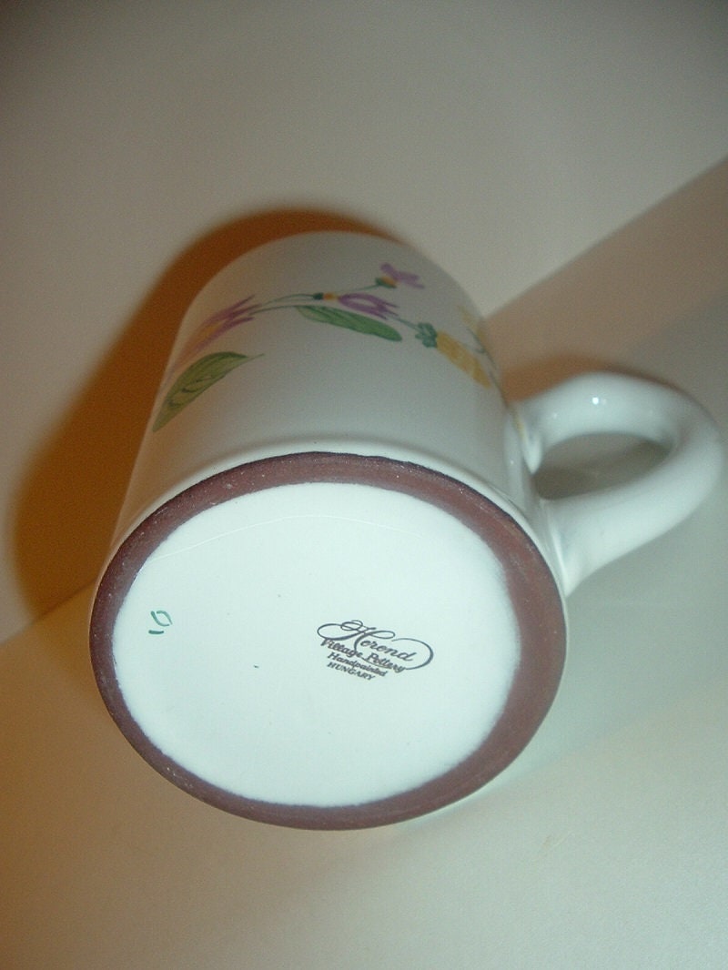 This Herend Hungary Village Pottery red ware mug measures approx. 4.25"H and 5" from handle to opposite rim. It is done in a white glaze with handpainted flowers and a thin light green rim trim. No chips or cracks. A Herend mark is on the bottom. A nice one! I gladly combine shipping.