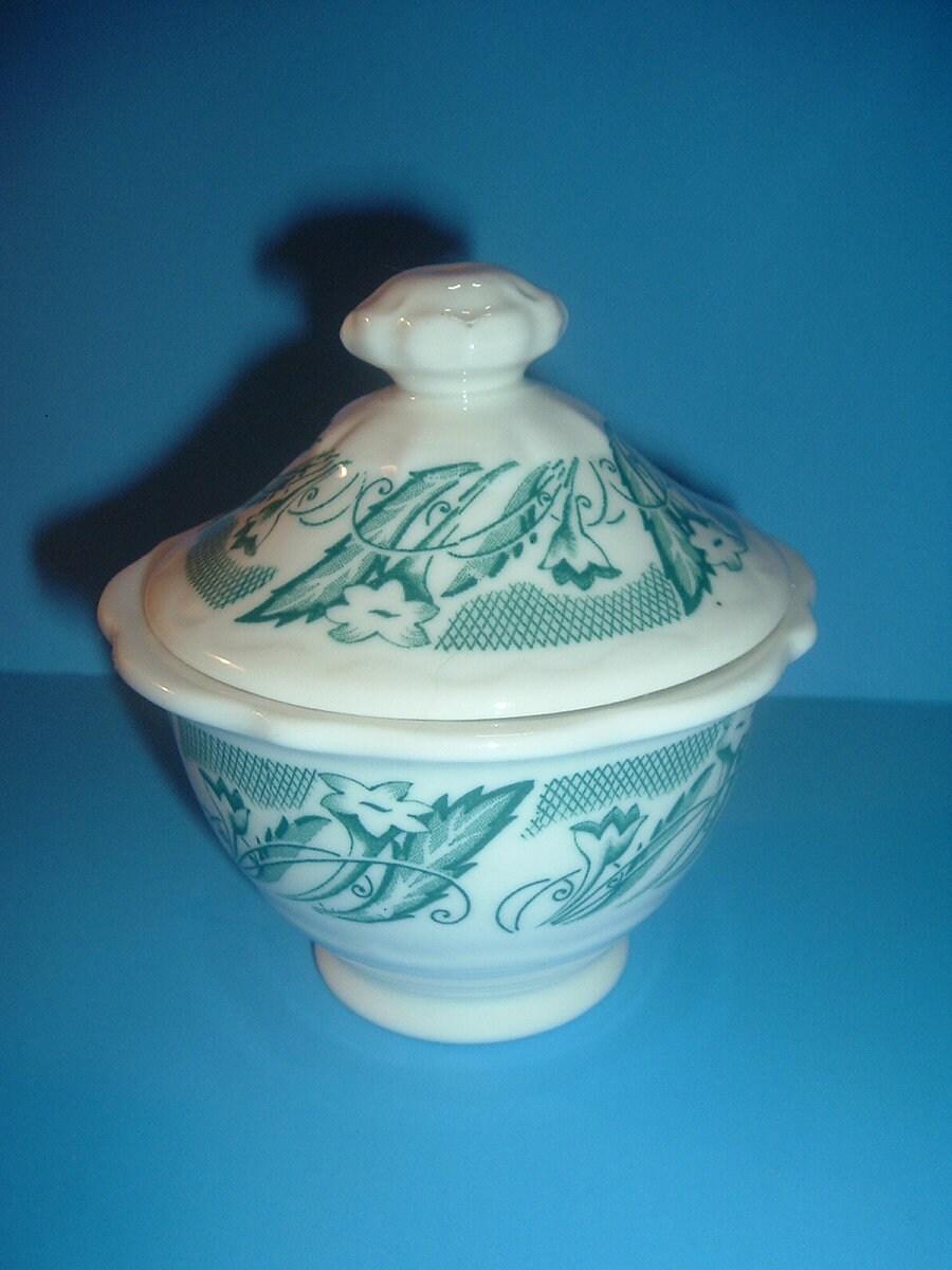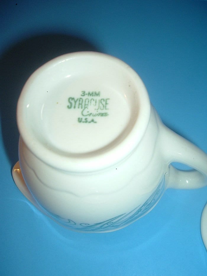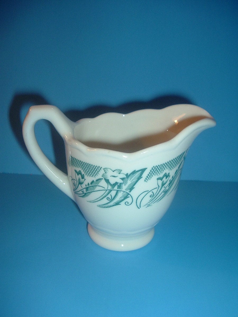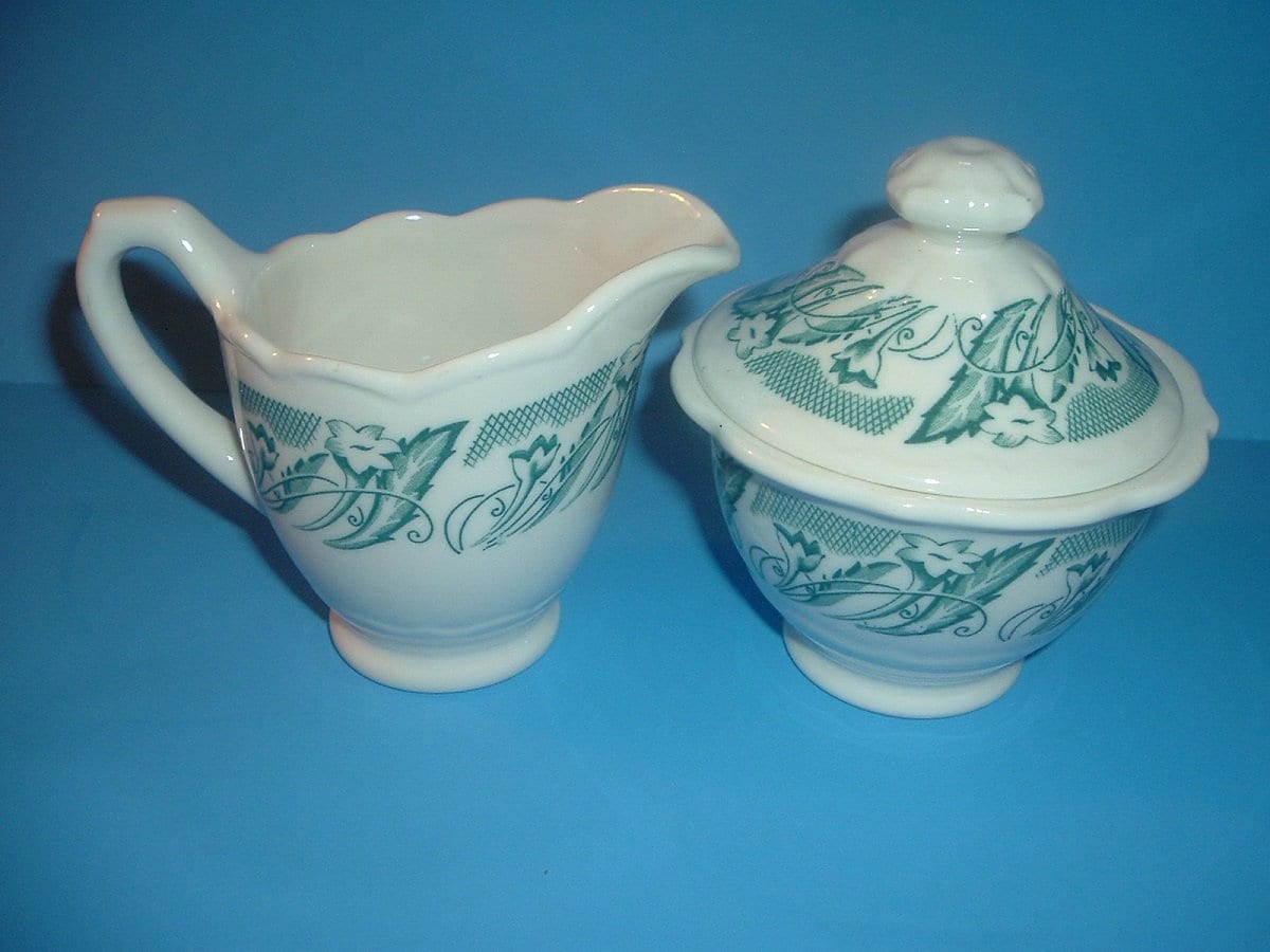 This 2 piece pair of Syracuse China USA restaurant ware consists of a creamer measuring approx. 3 7/8"H and 4 7/8" from spout to handle, and a lidded sugar approx. 4.5"H including lid and approx. 4.5"W (measured straight across widest point). They are a heavy restaurant ware type of china, and each features a teal colored floral or flowers pattern. No chips or cracks on either. Both are signed on bottom -- part of the signing says Chinex (or something like it). A nice pair! I gladly combine shipping.