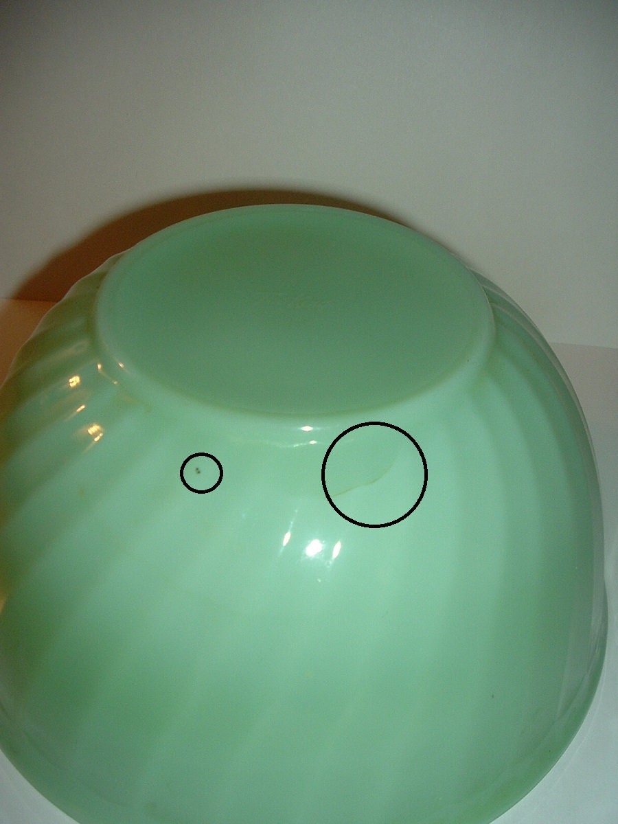 This vintage Fire King jadeite glass kitchen mixing bowl measures5"H and 8 7/8" straight across the top rim. No chips or cracks. No utensil markings inside -- nice, clean and clear. I show a mold line and tiny dark dot in the glass -- on the outside, near bottom -- both factory flaws. Couldn't have been used much -- it's in nice shape! The Fire King mark is on the bottom. A nice one! I gladly combine shipping.