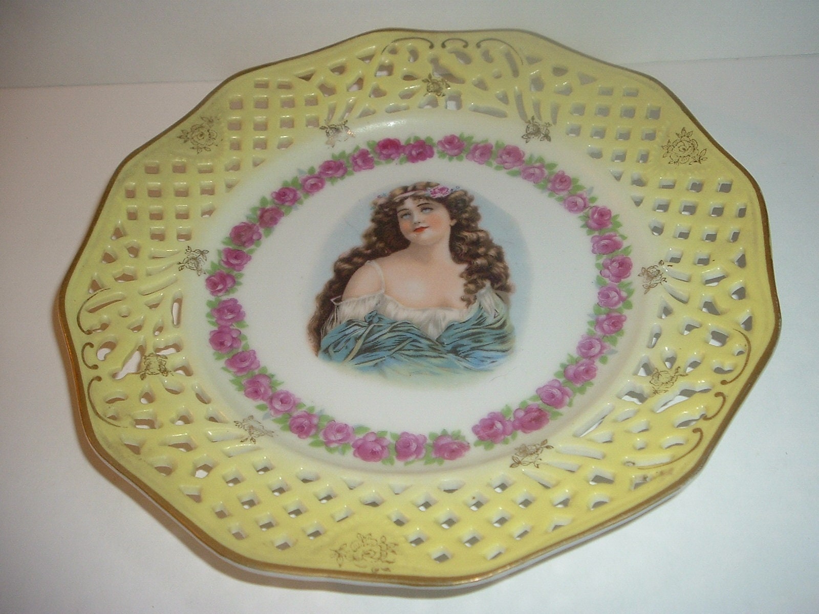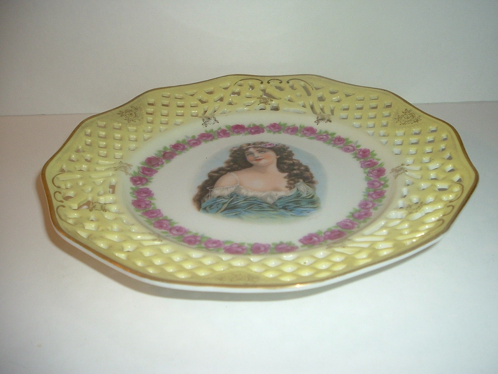 This vintage lady portrait plate measures approx. 9.25" across. It features a lady portrait in the center, surrounded by a garland of pink roses. The yellow outer edge is reticulated, and has a little gold designwork. No chips, no cracks, and no scratching. The decorations are all in good shape. There are hanging holes, and an old hanging wire on the backside. In the last photo, I have circled what I think may be a faded mark -- I can't make it out. Very pretty! I gladly combine shipping.