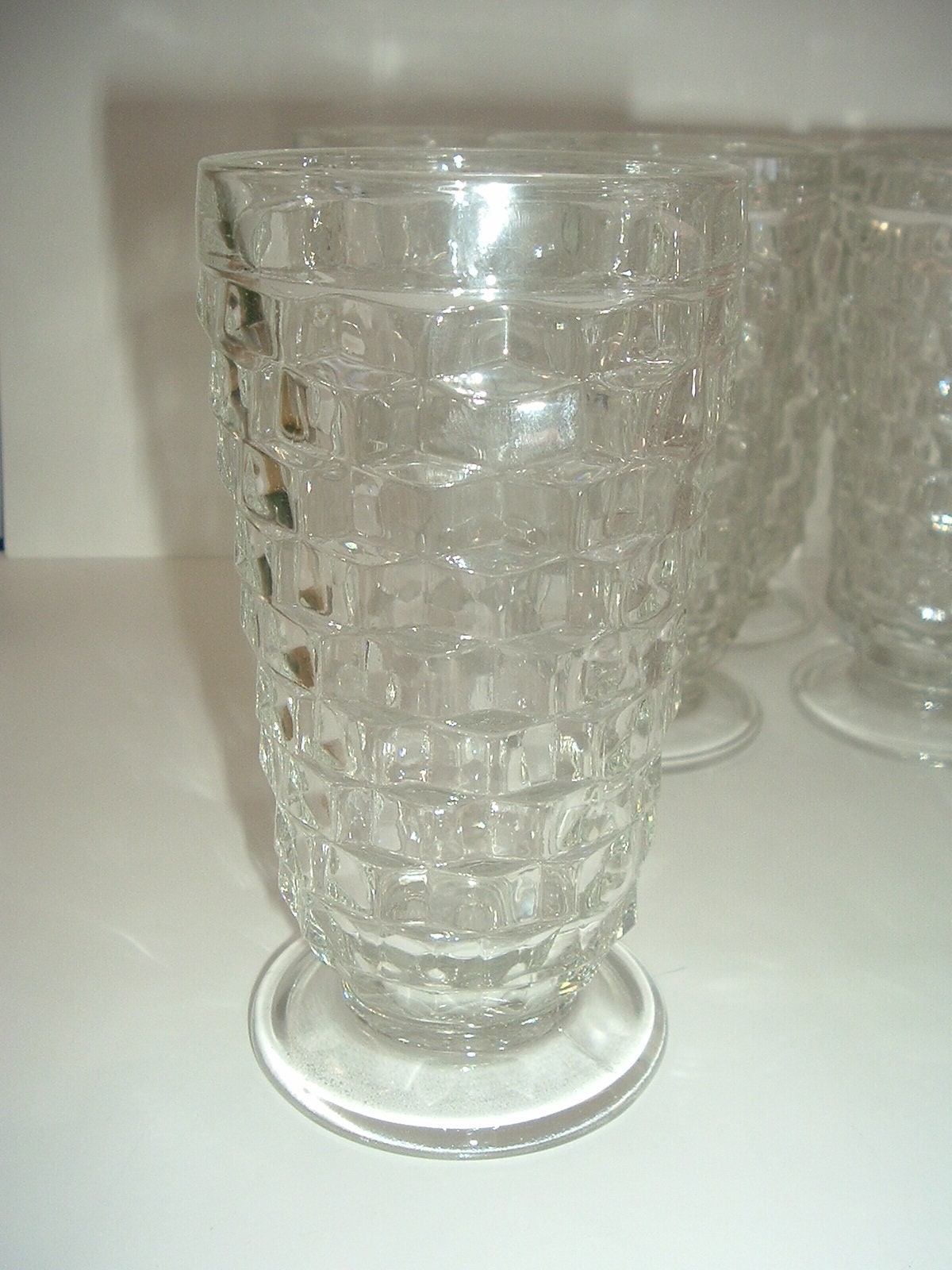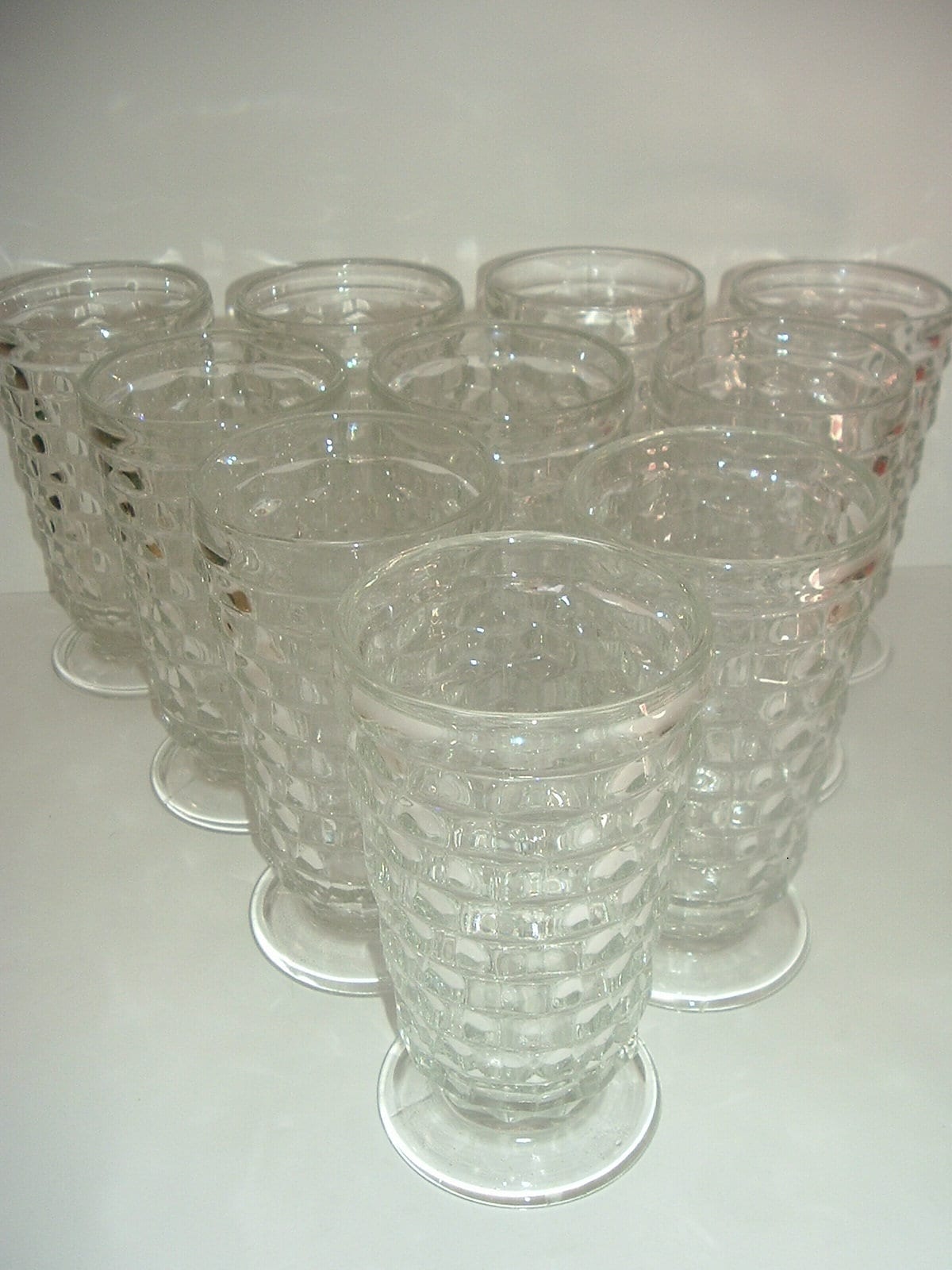 This is a set of ten footed iced tea tumblers or glasses, each approx. 5 7/8"H. They have a cube pattern all around the outside of each. I'm not sure if they are Jeannette Cubist, Indiana Whitehall or Fostoria American. All are in good shape with no chips or cracks. Nice and clean inside and out. All 10! I gladly combine shipping!