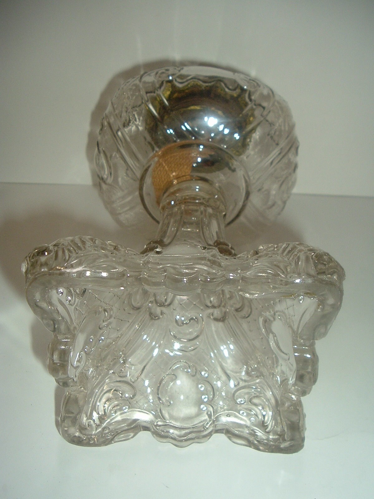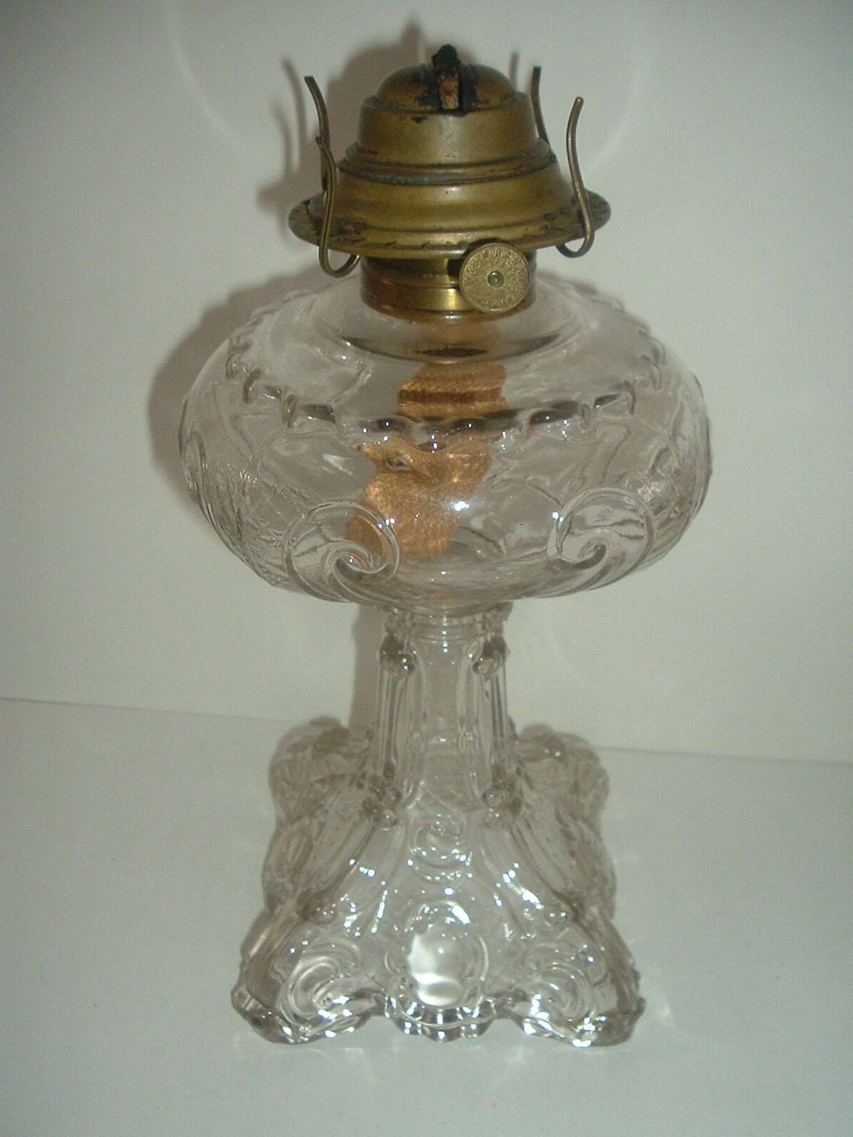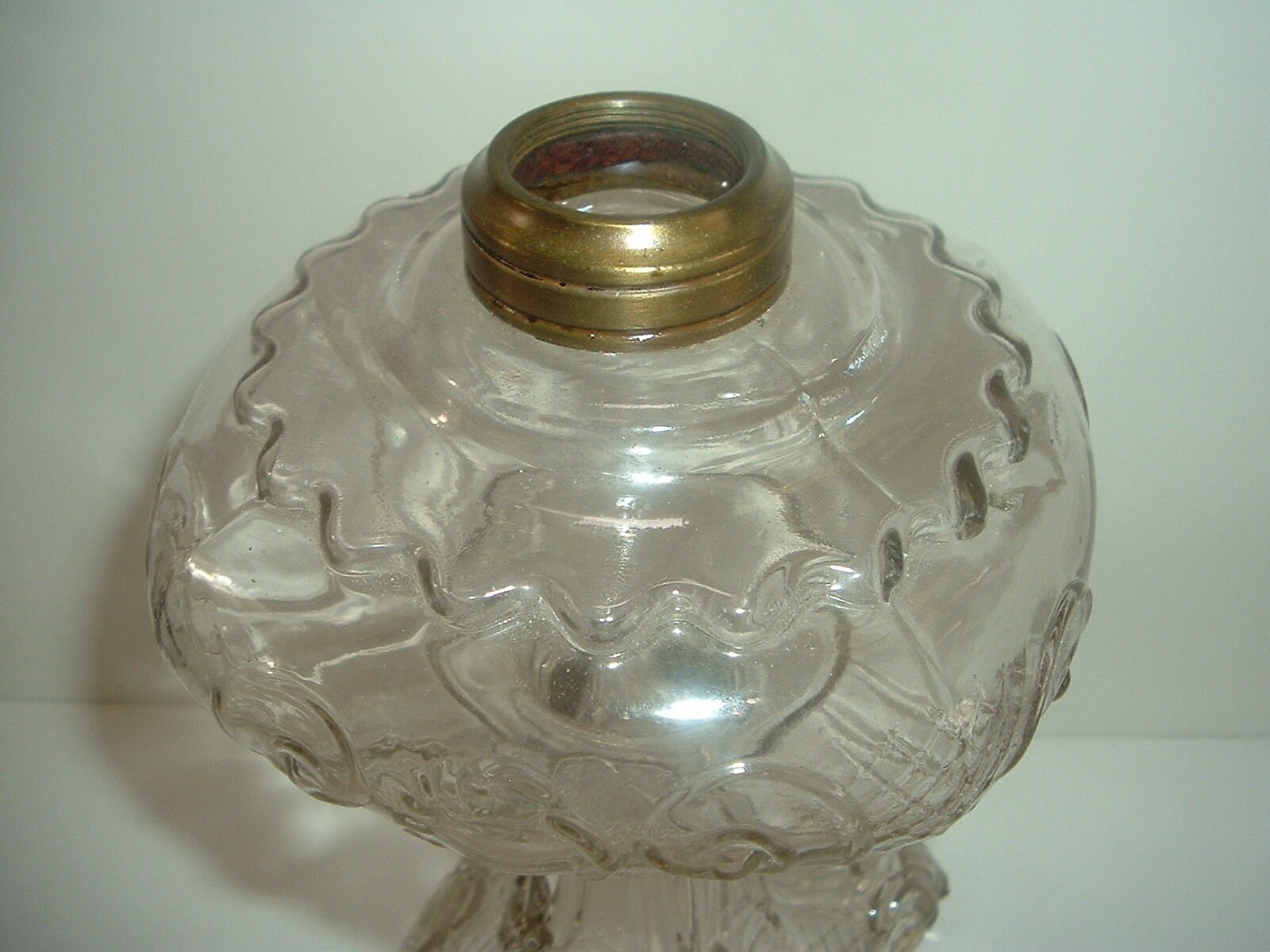 This vintage glass pattern glass oil lamp measures approx. 11.5"H (as pictured in photo 1 -- including metal top) and 5.25"W (measured straight across widest point). It's an old one. I think this is Princess Feather (the pattern name). I don't know the maker. No chips or cracks. I feel a little factory roughness on the bottom inner rim, otherwise, great shape. In photos 6 and 7, I show the metal top. It shows wear -- I don't know if it needs to be adjusted to function properly. I see P&A Mfg Co Banner on the knob. A nice old one . I gladly combine shipping.