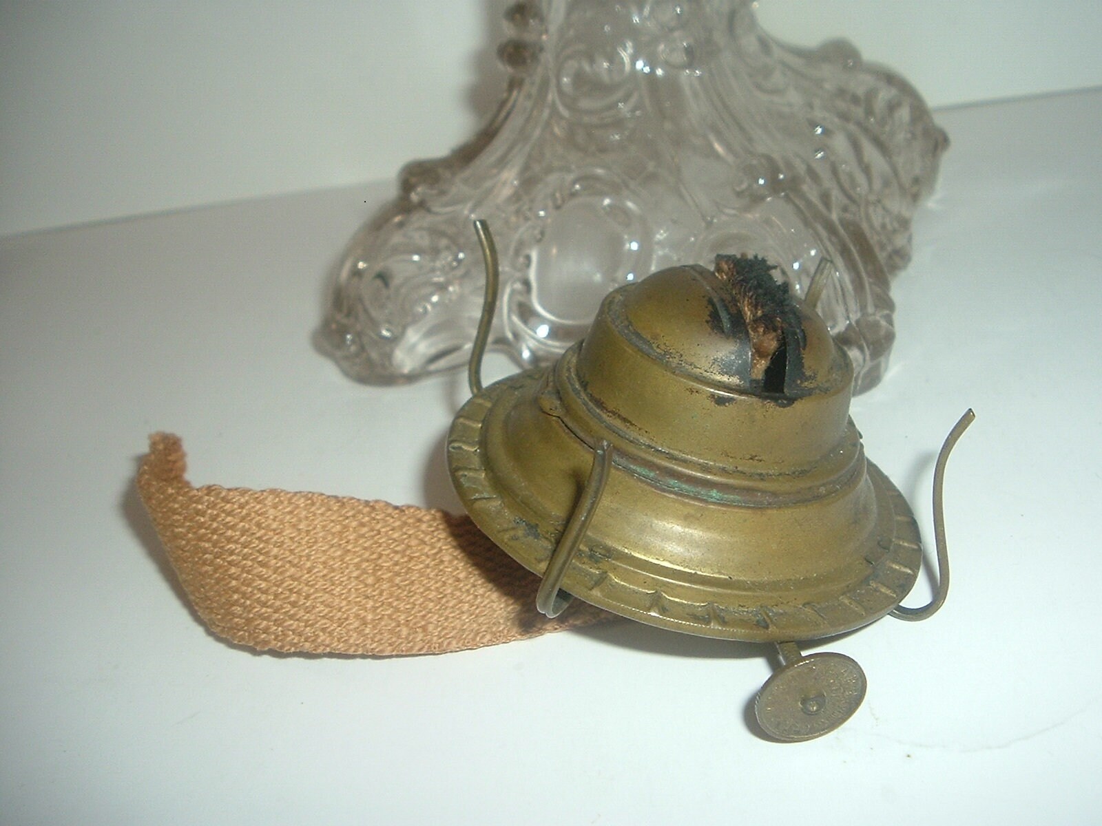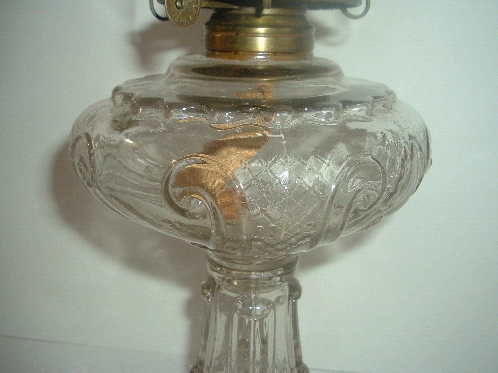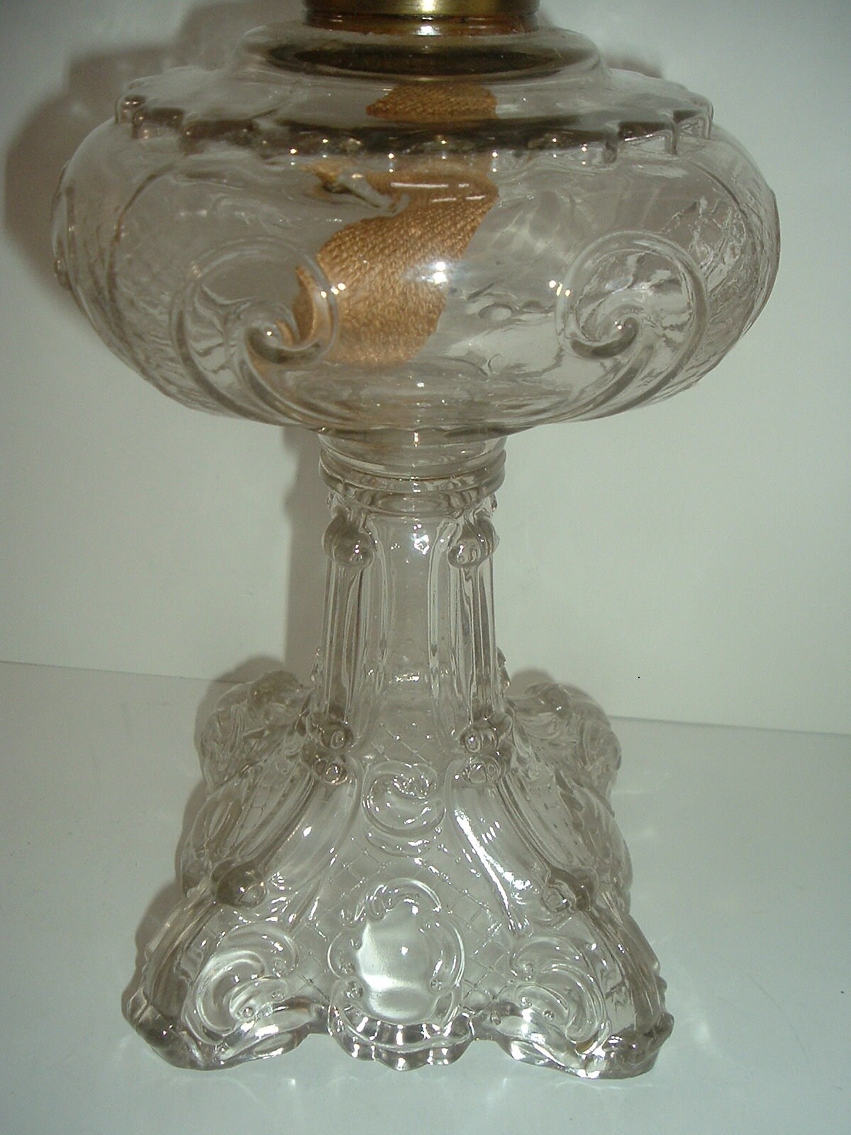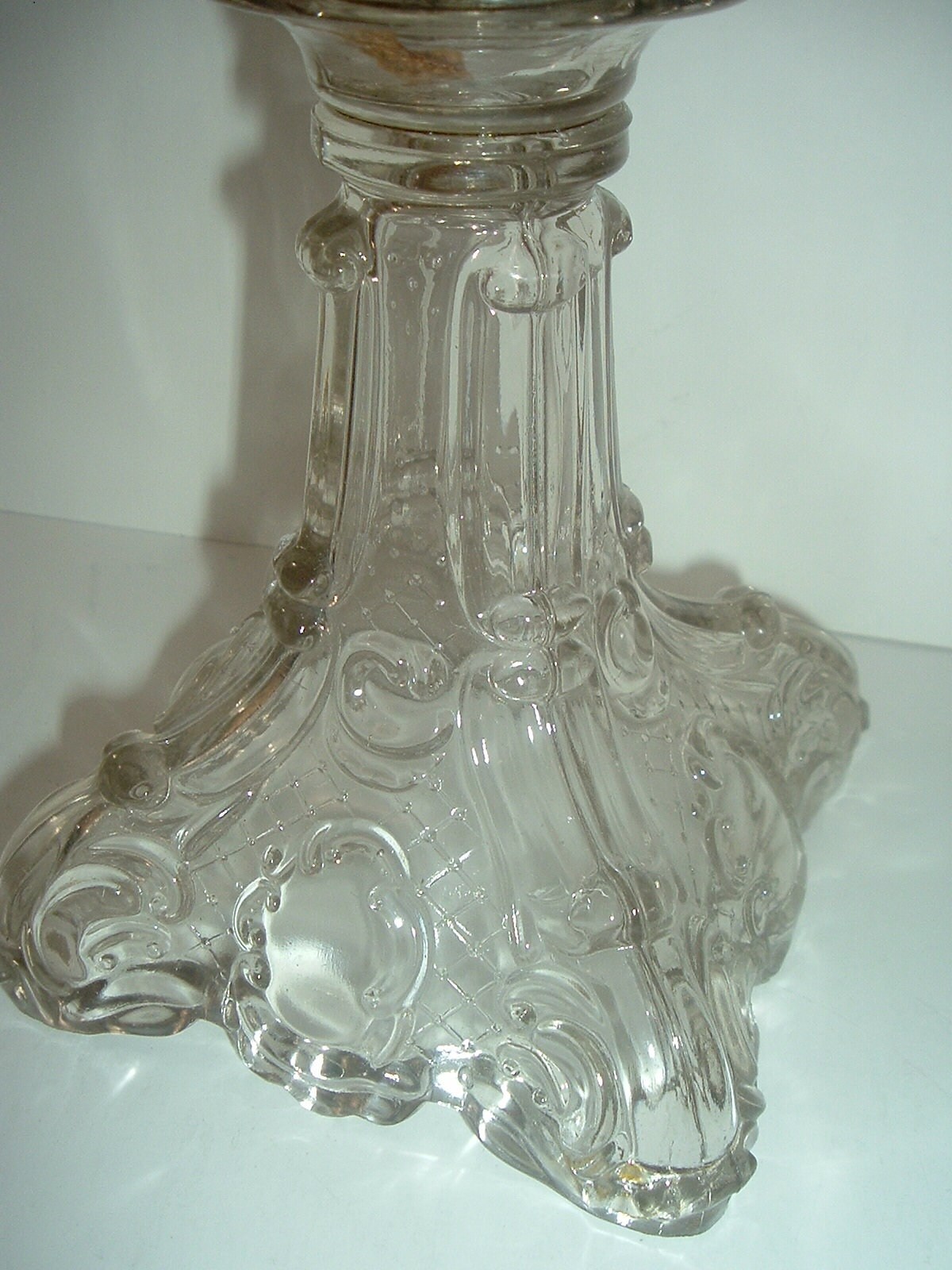 This vintage glass pattern glass oil lamp measures approx. 11.5"H (as pictured in photo 1 -- including metal top) and 5.25"W (measured straight across widest point). It's an old one. I think this is Princess Feather (the pattern name). I don't know the maker. No chips or cracks. I feel a little factory roughness on the bottom inner rim, otherwise, great shape. In photos 6 and 7, I show the metal top. It shows wear -- I don't know if it needs to be adjusted to function properly. I see P&A Mfg Co Banner on the knob. A nice old one . I gladly combine shipping.